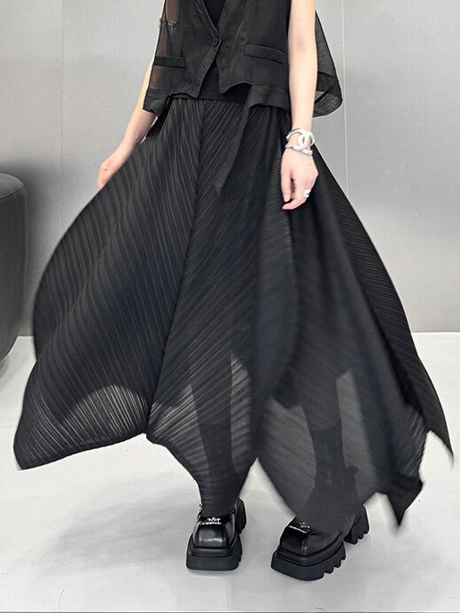 イレギュラーミドルレングスプリーツカーブスカート。