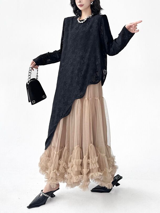 斜めに流れるヘムラインが個性的なムードを演出。