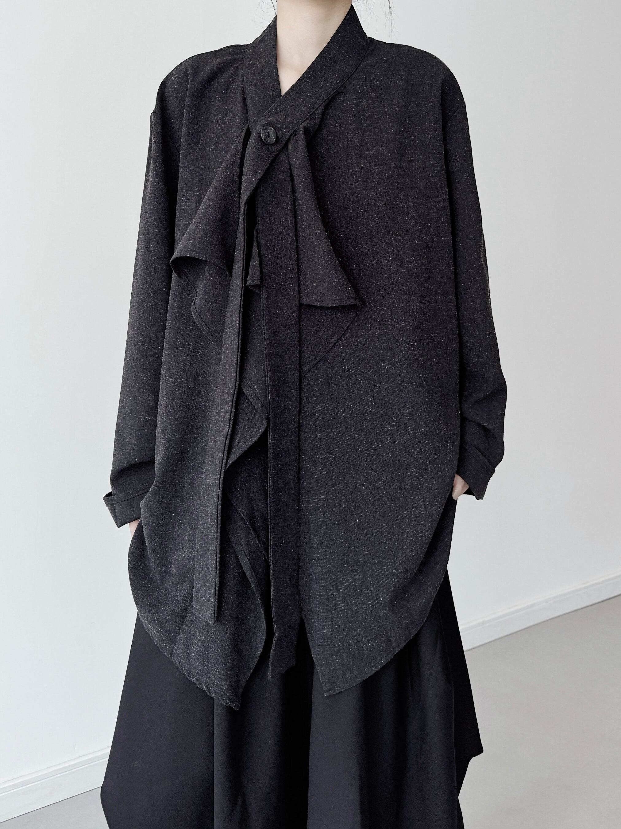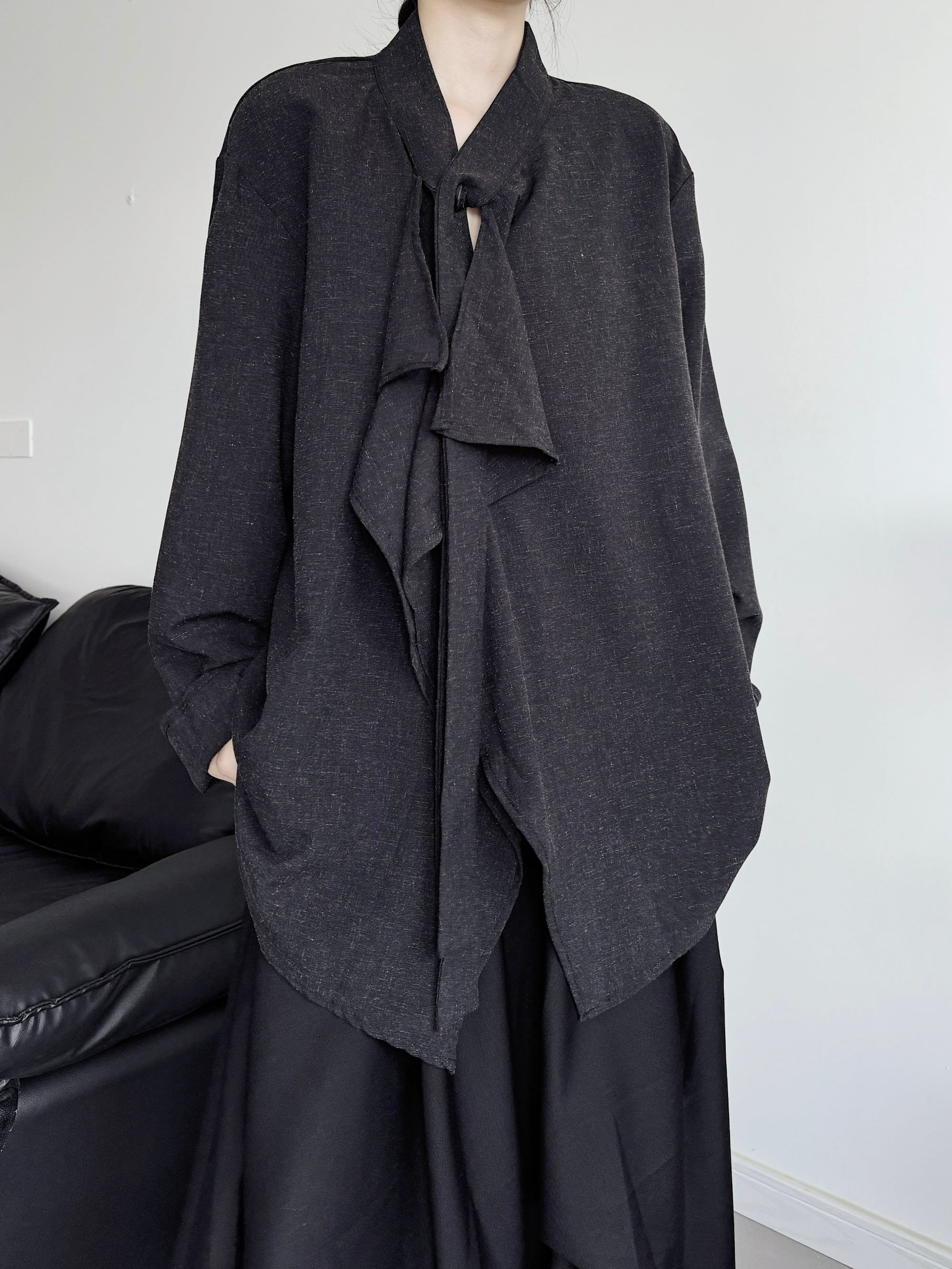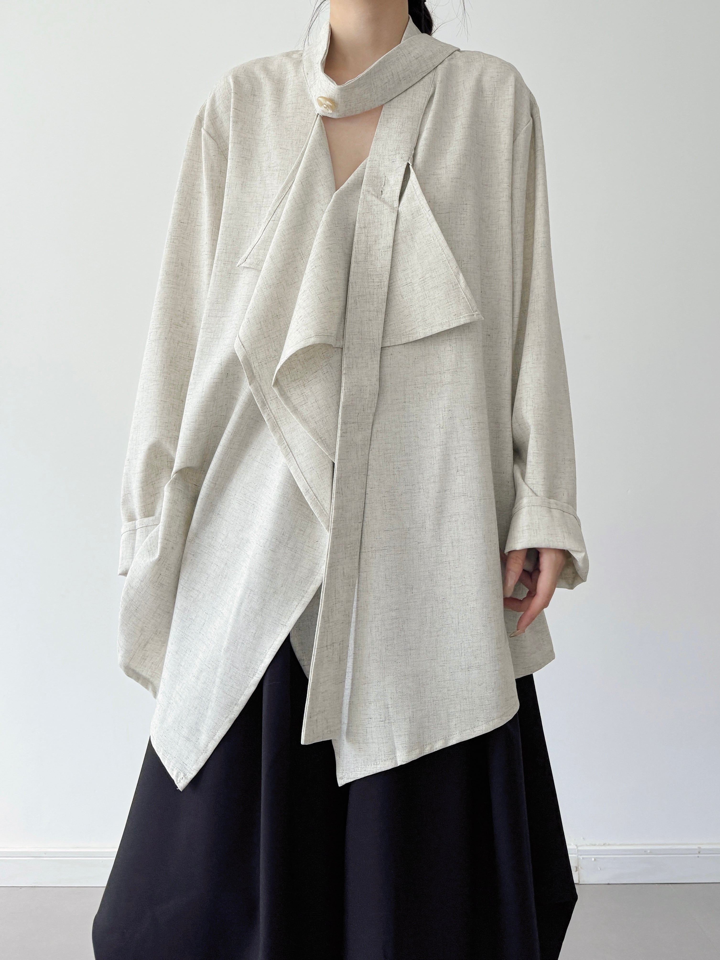 Ribbon stand collar artistic style asymmetrical top 2color [T2454]
