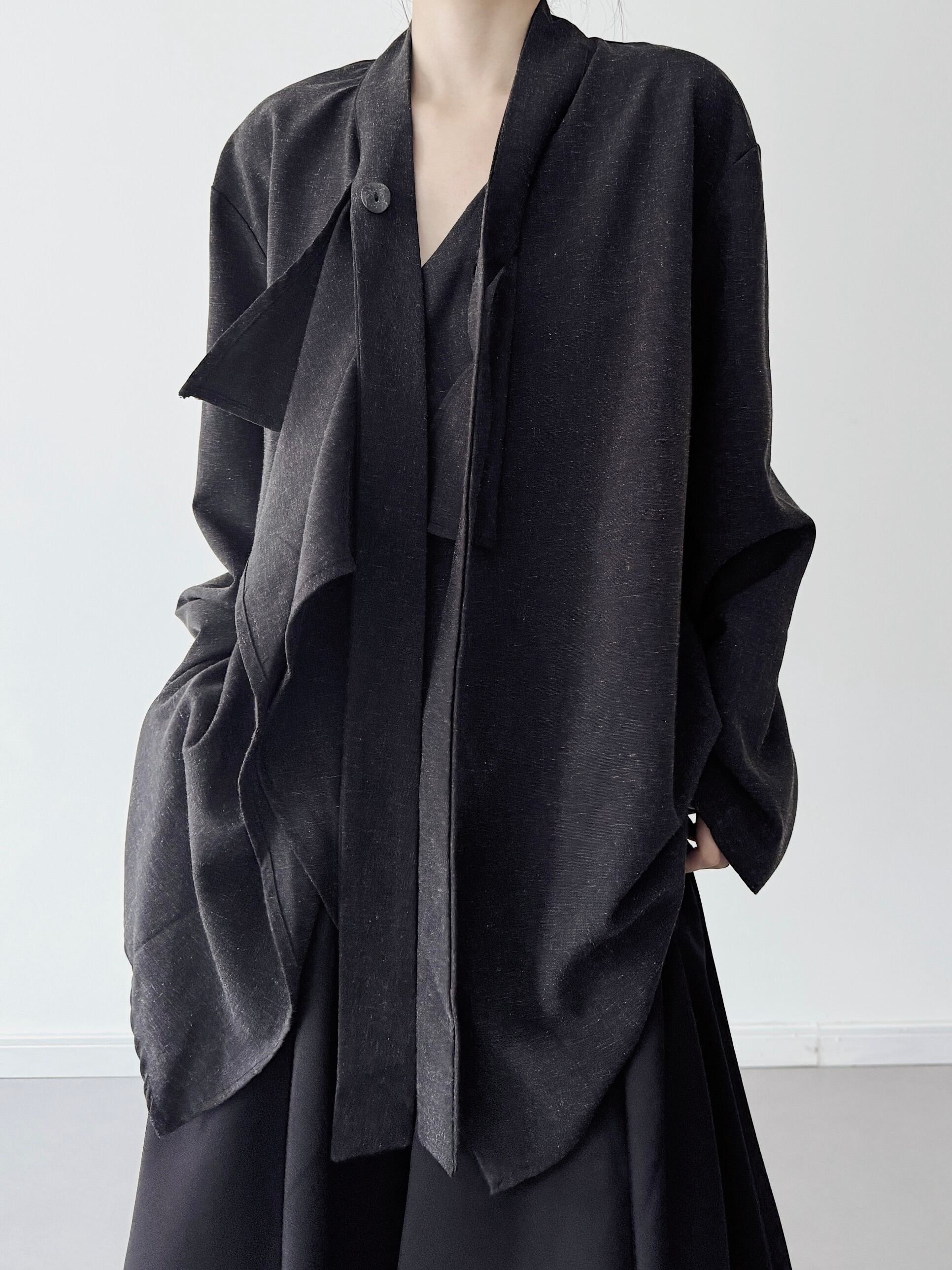 リボンスタンドカラーアーティスティックスタイルアシンメトリートップス。