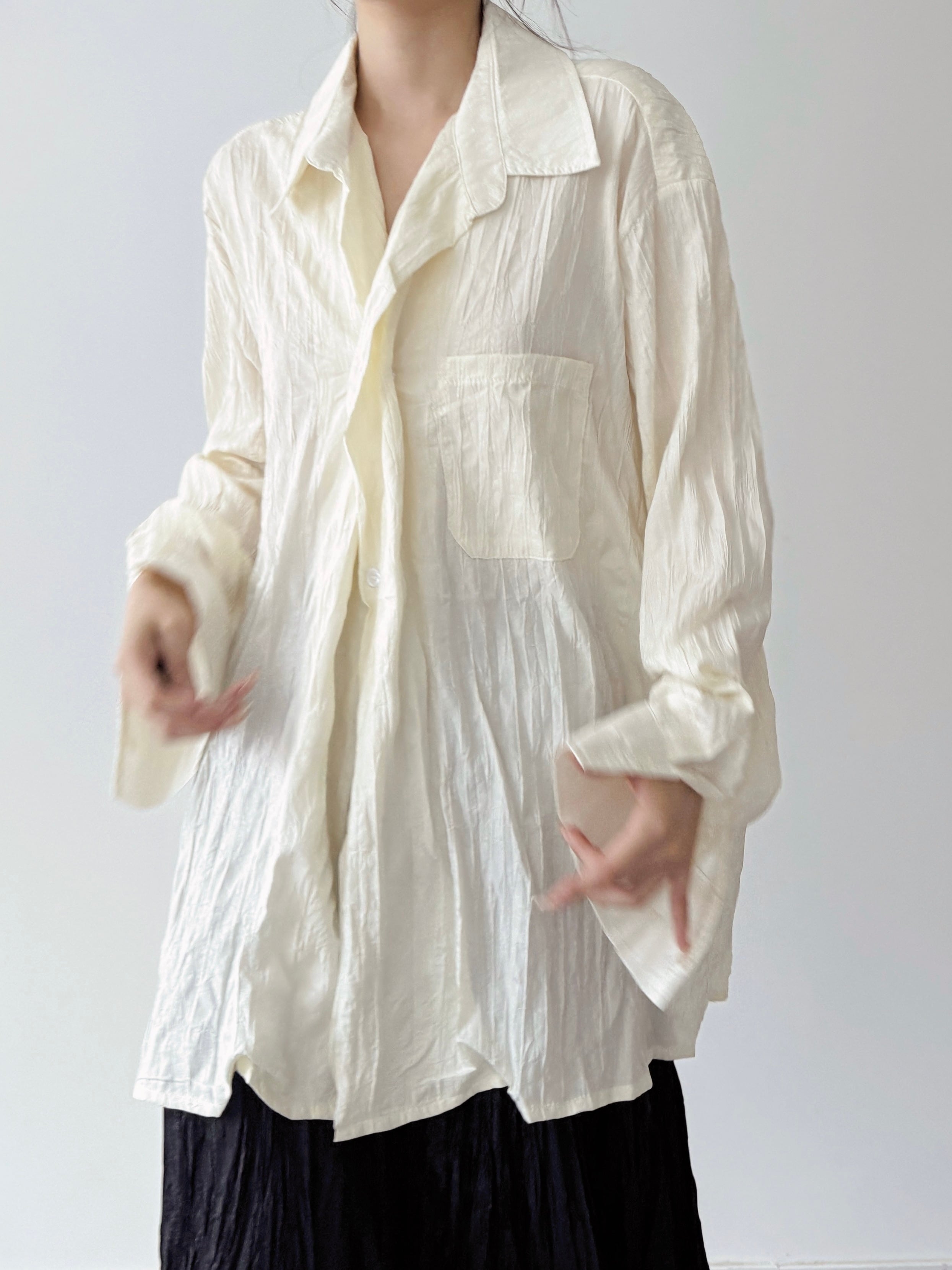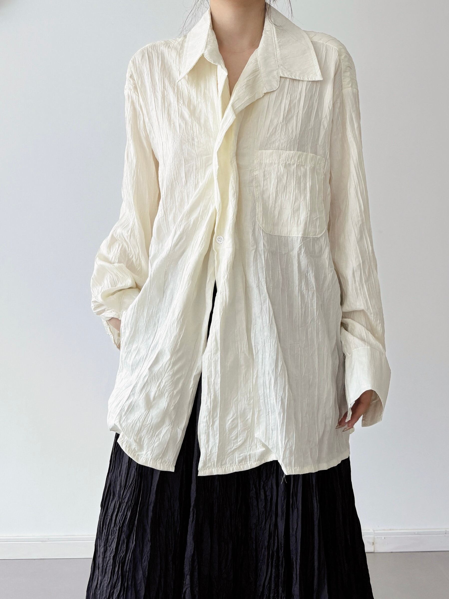 プリーツテクスチャーニッチデザインラペルスリムシャツ。