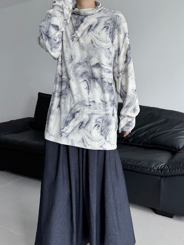水墨画のような柄がシンプルコーデにアートな存在感をプラス。