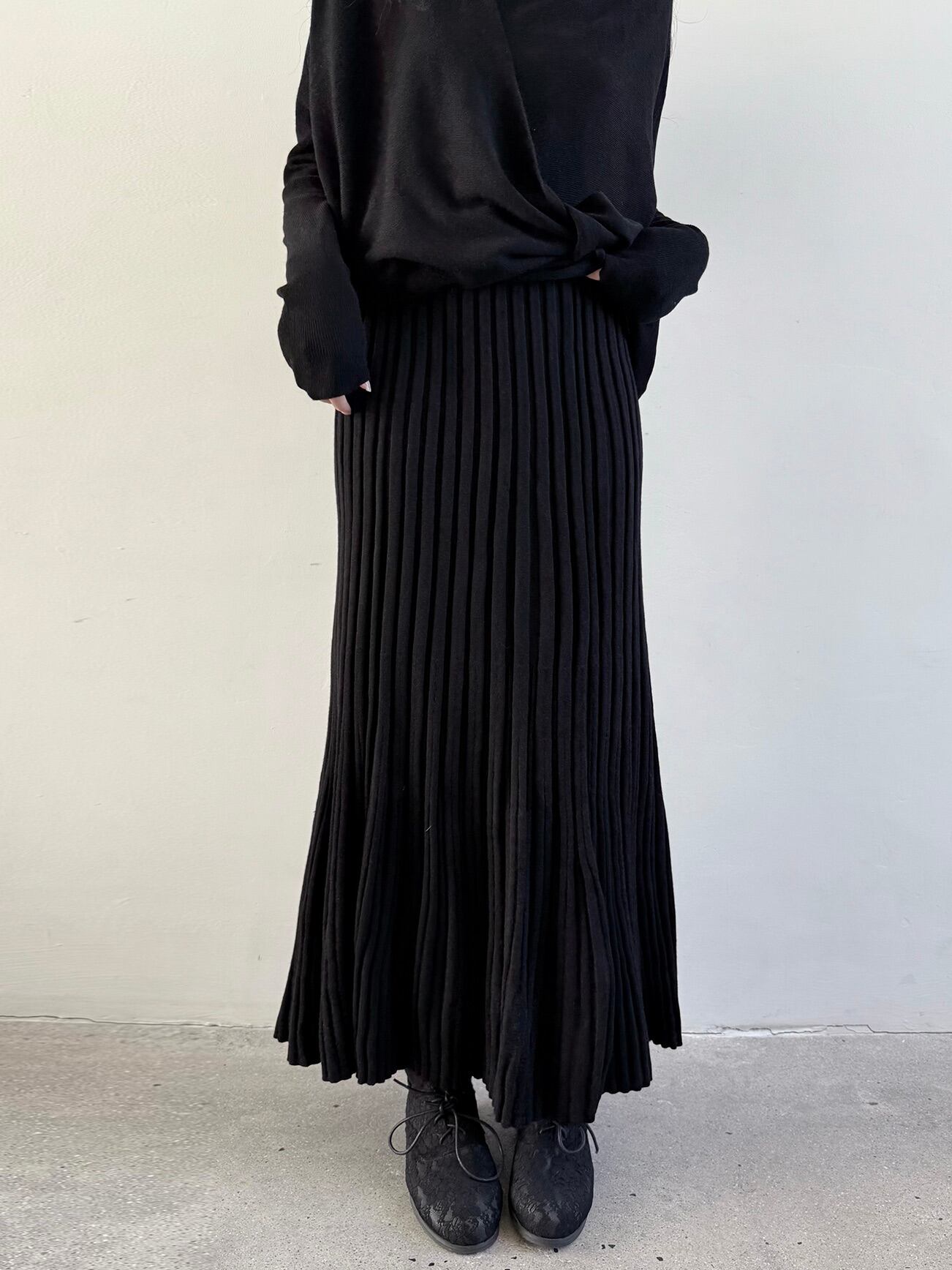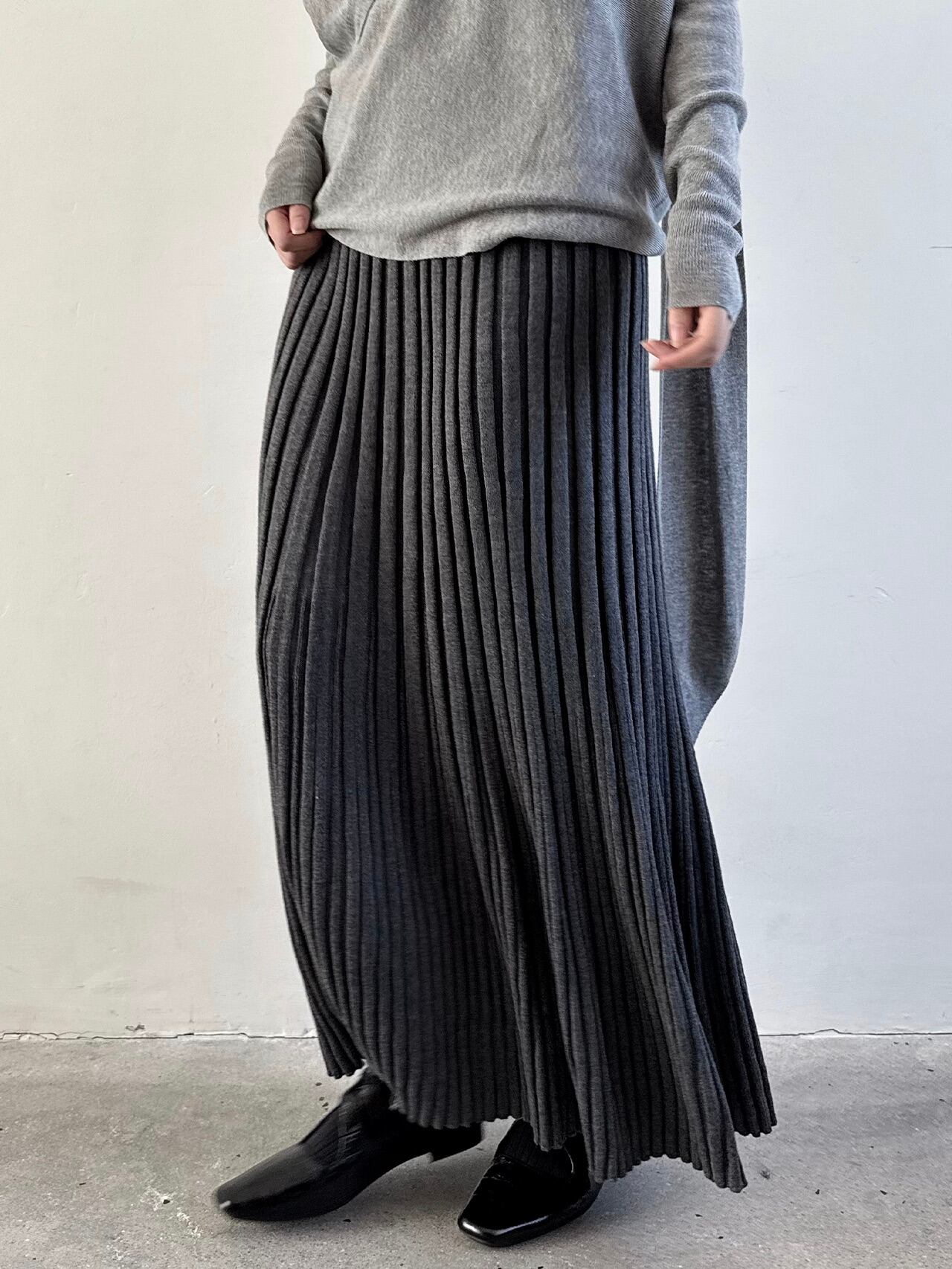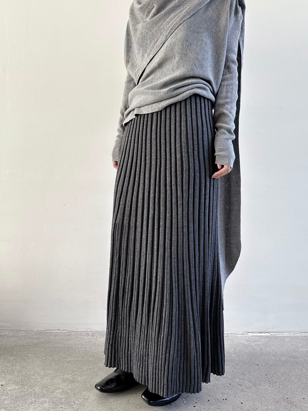 ウールブレンドレイジーニットプリーツスカート。