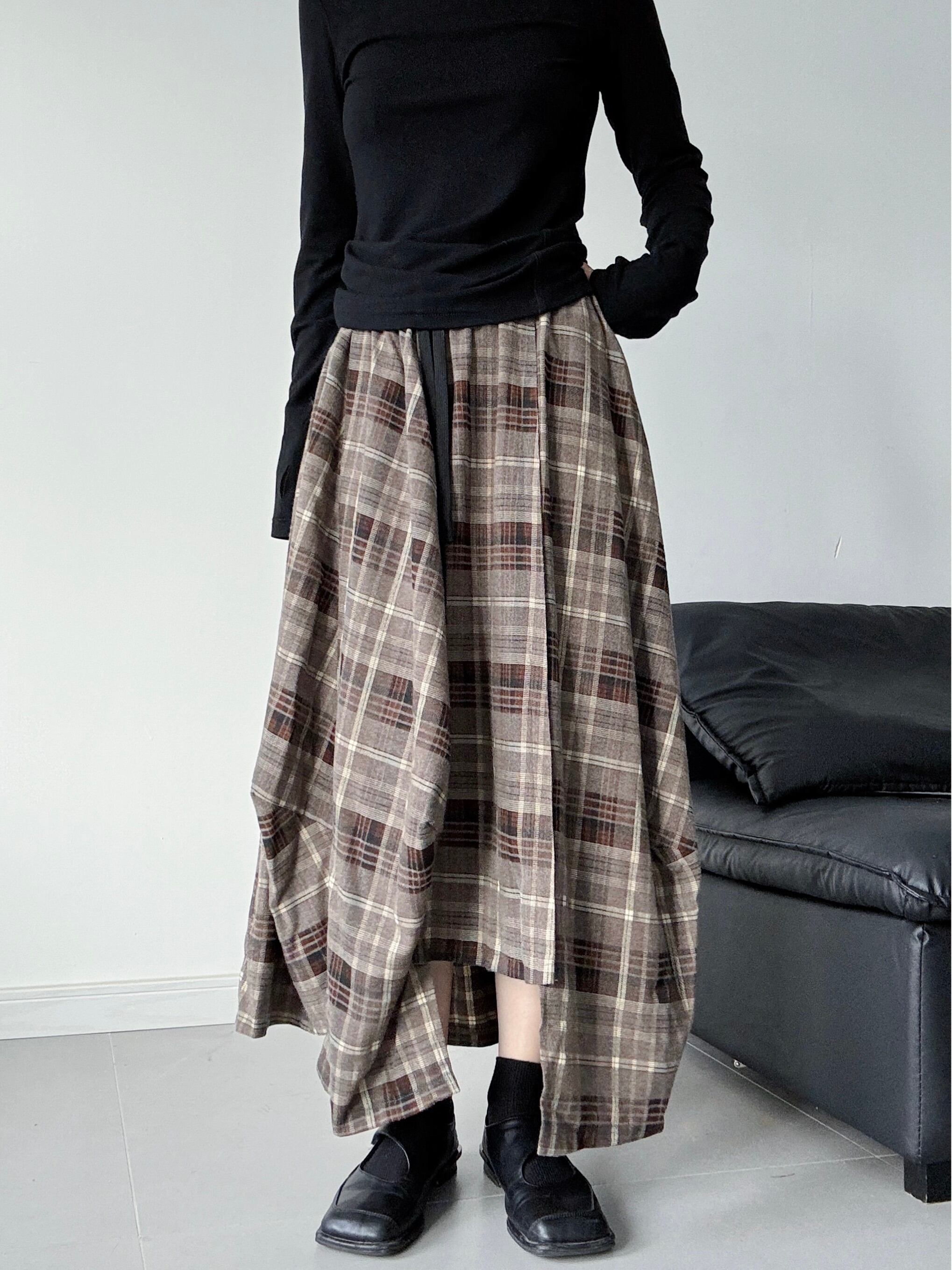 Wrinkled diagonal check drawstring wool skirt 2color [T2551]