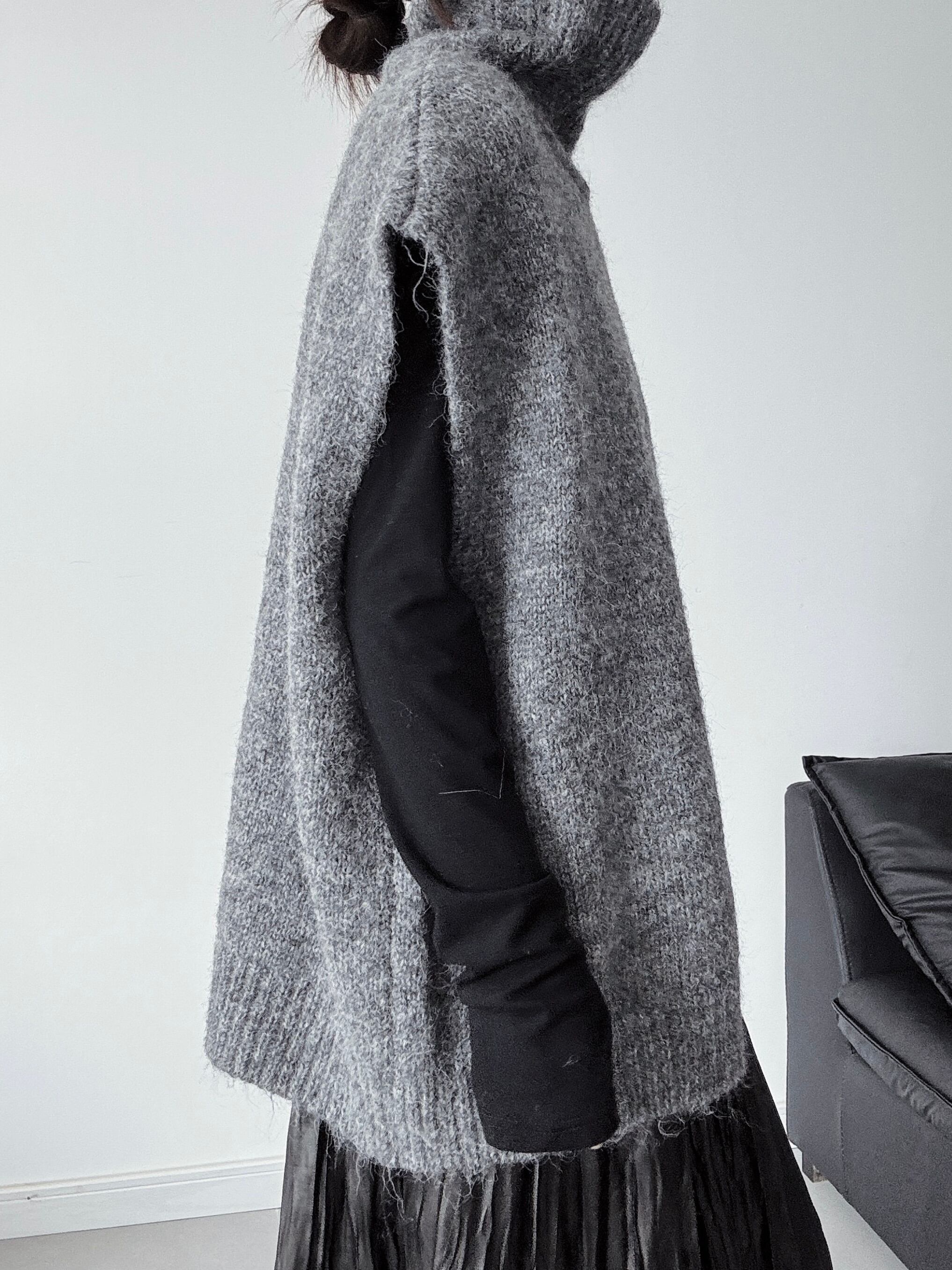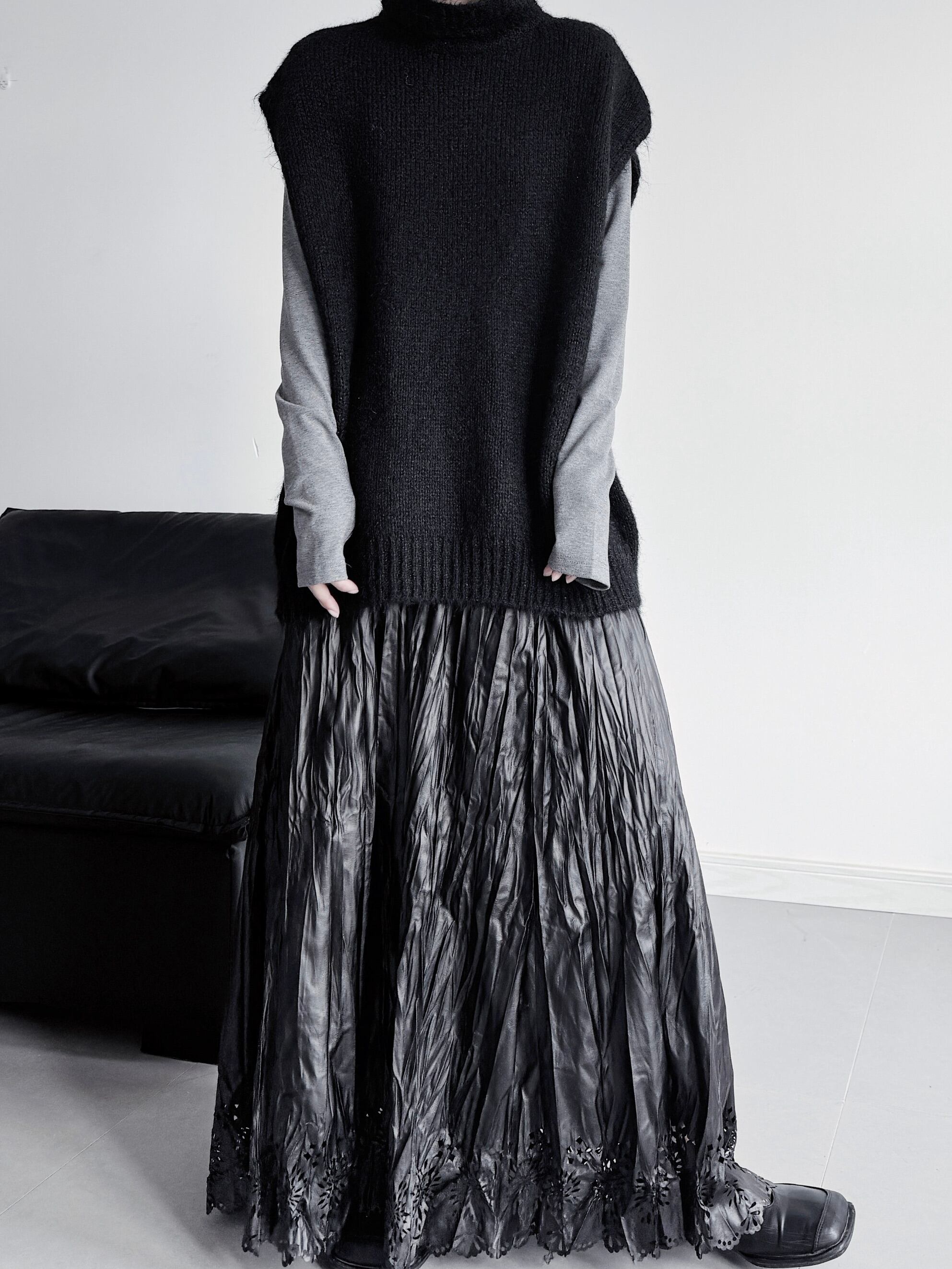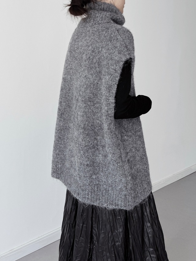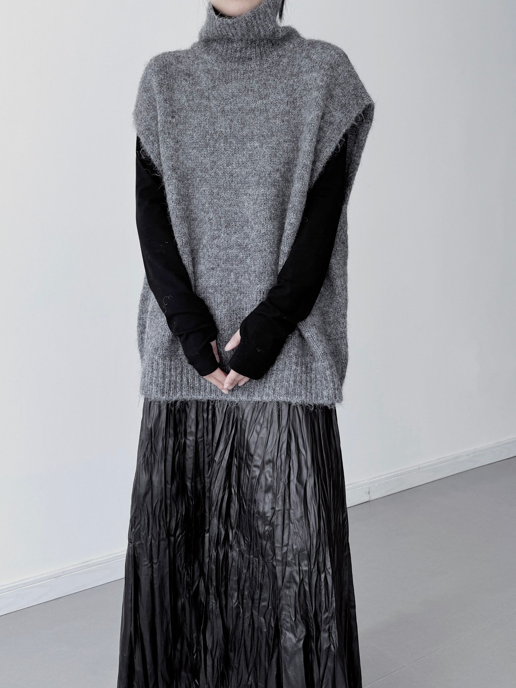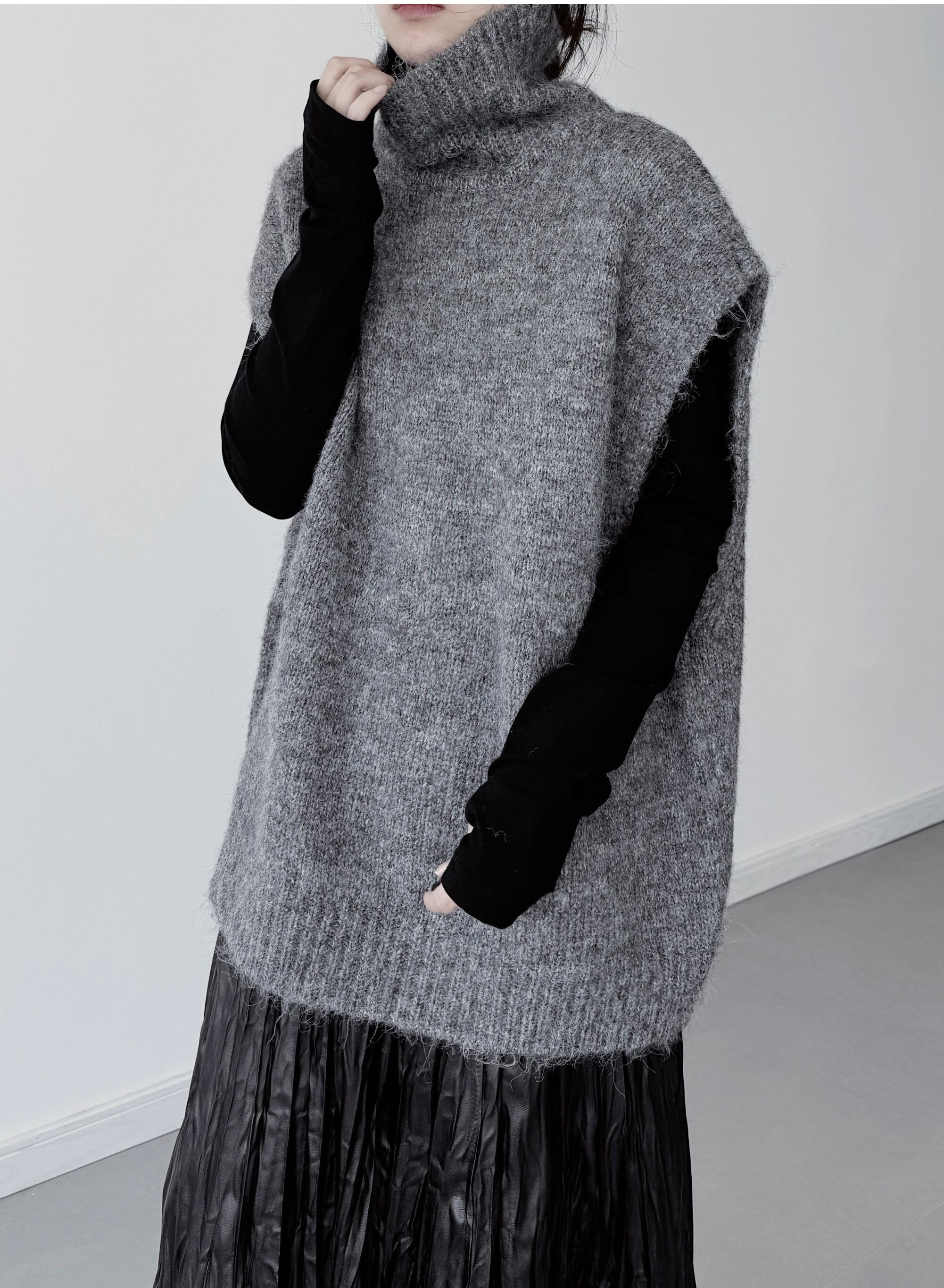 ハイカラースリーブレスレイヤードニット。