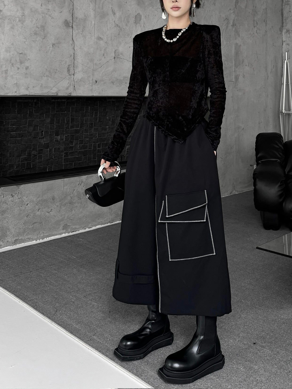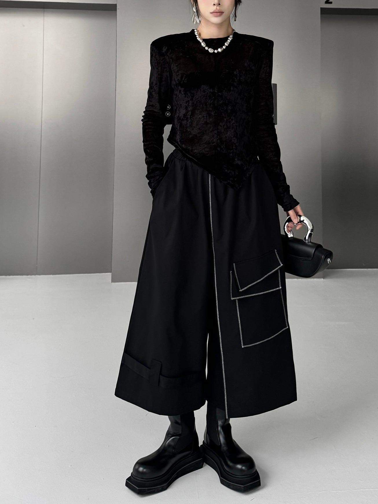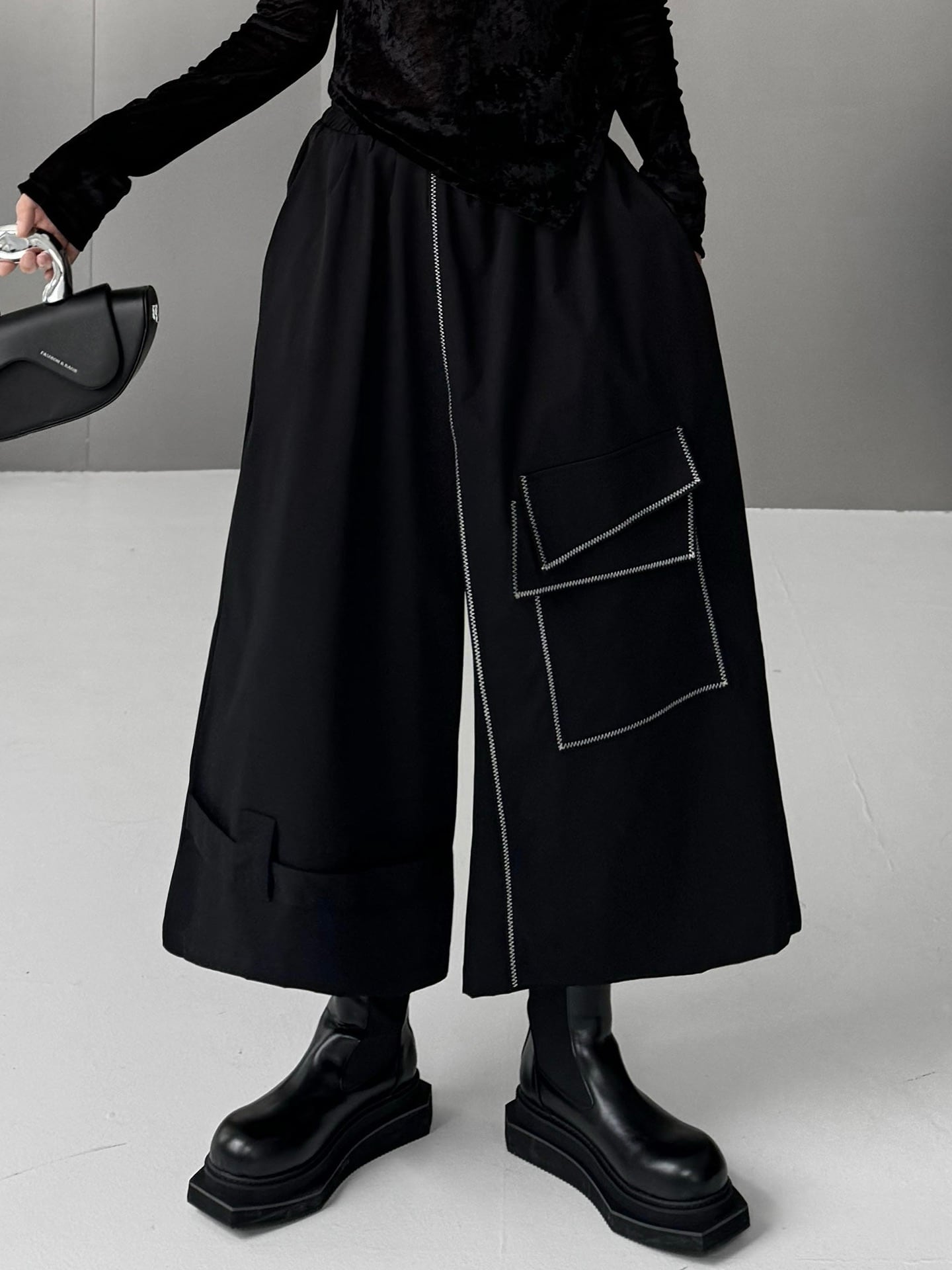 アシンメトリラインステッチワイドパンツ。