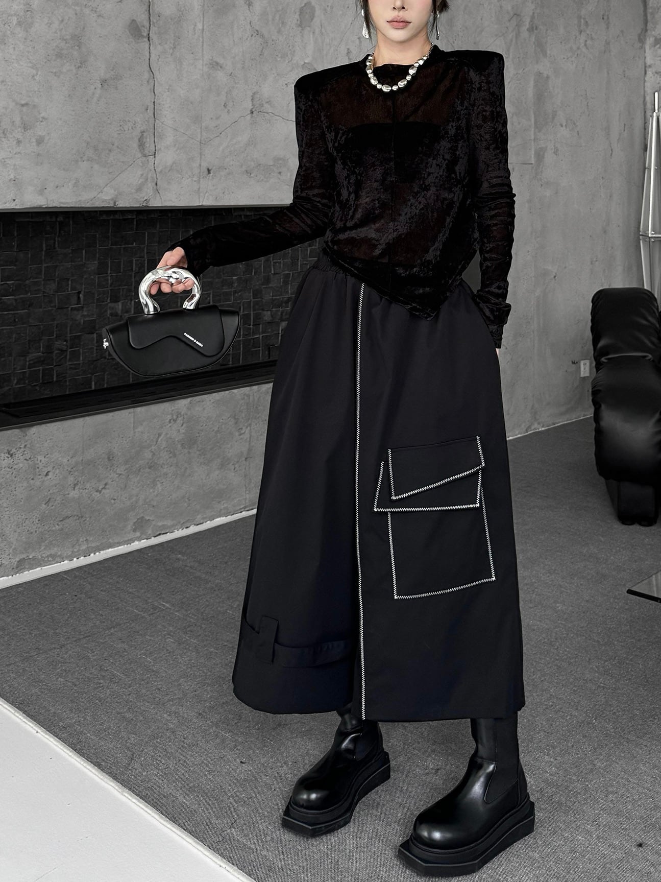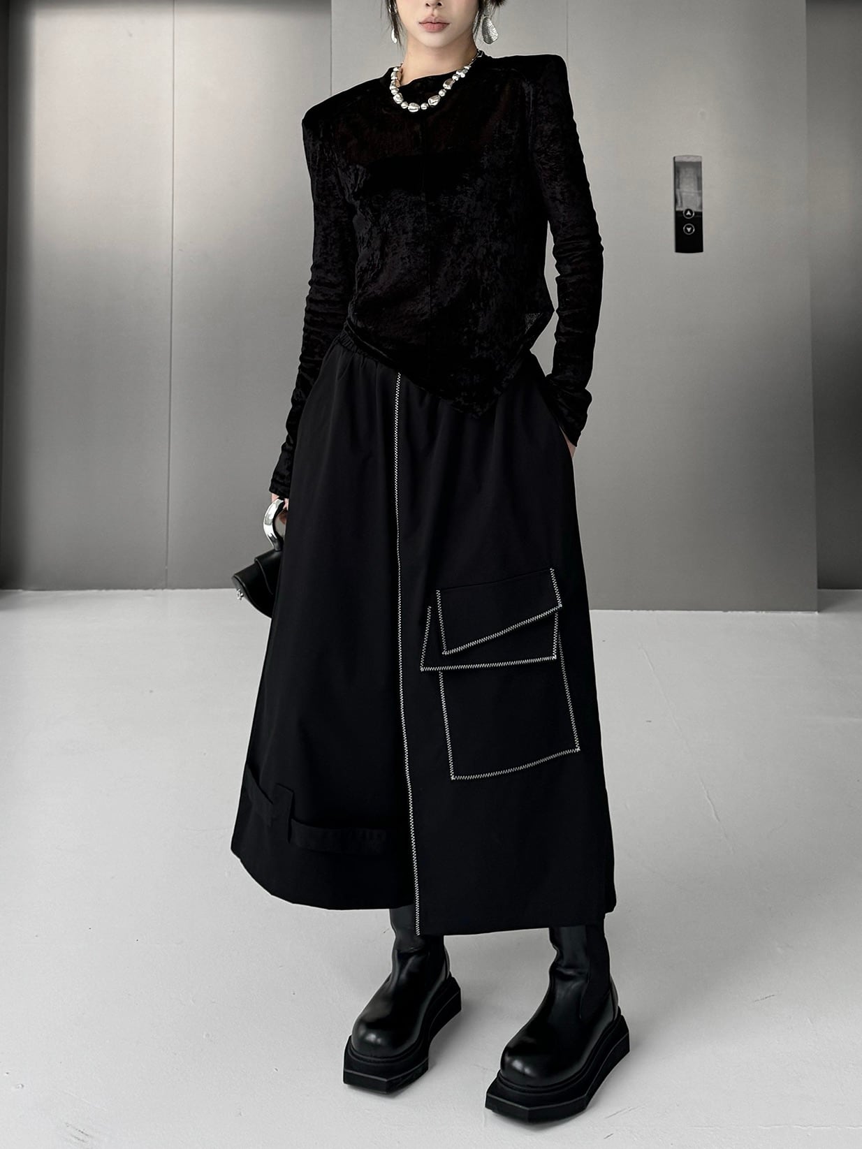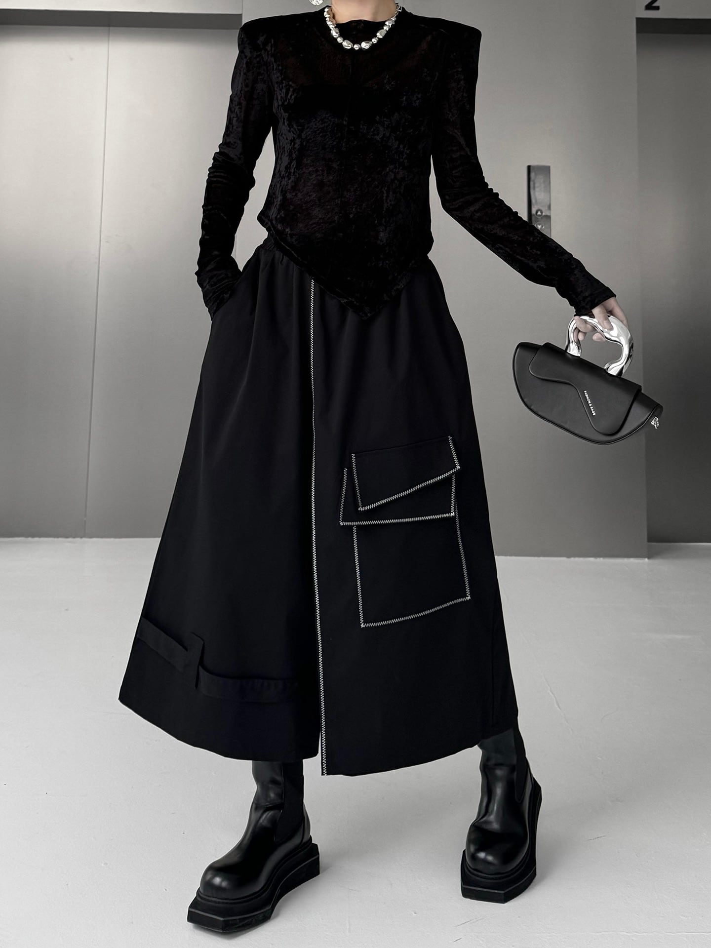 アシンメトリラインステッチワイドパンツ。