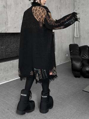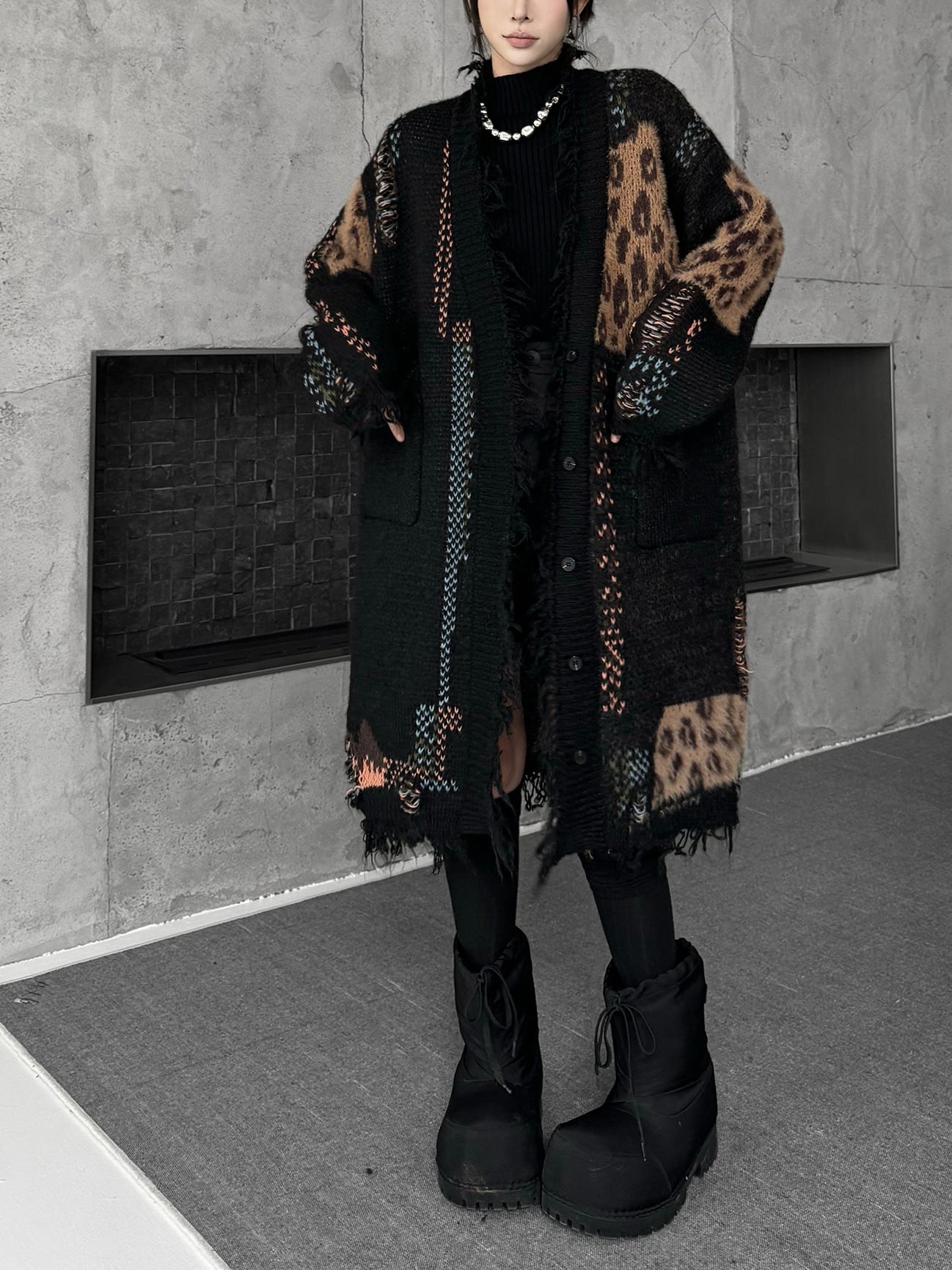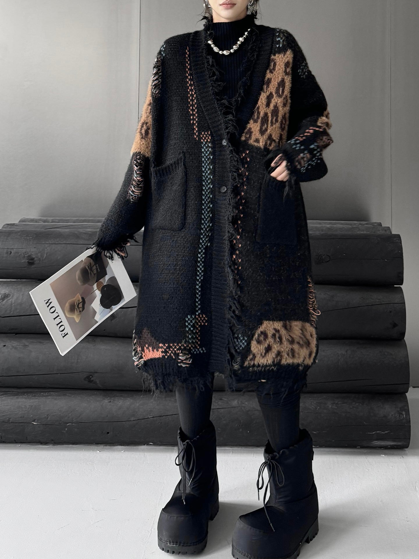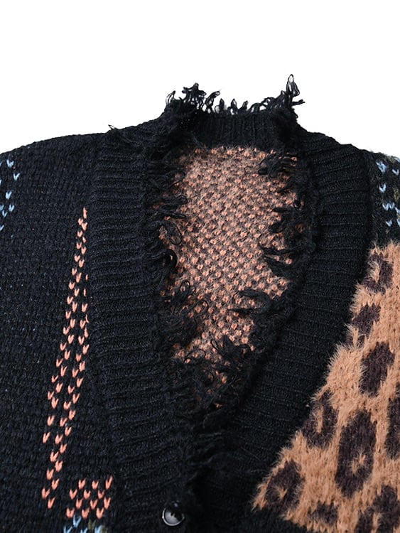 ルーズレオパードプリントパッチワークニットカーディガン。