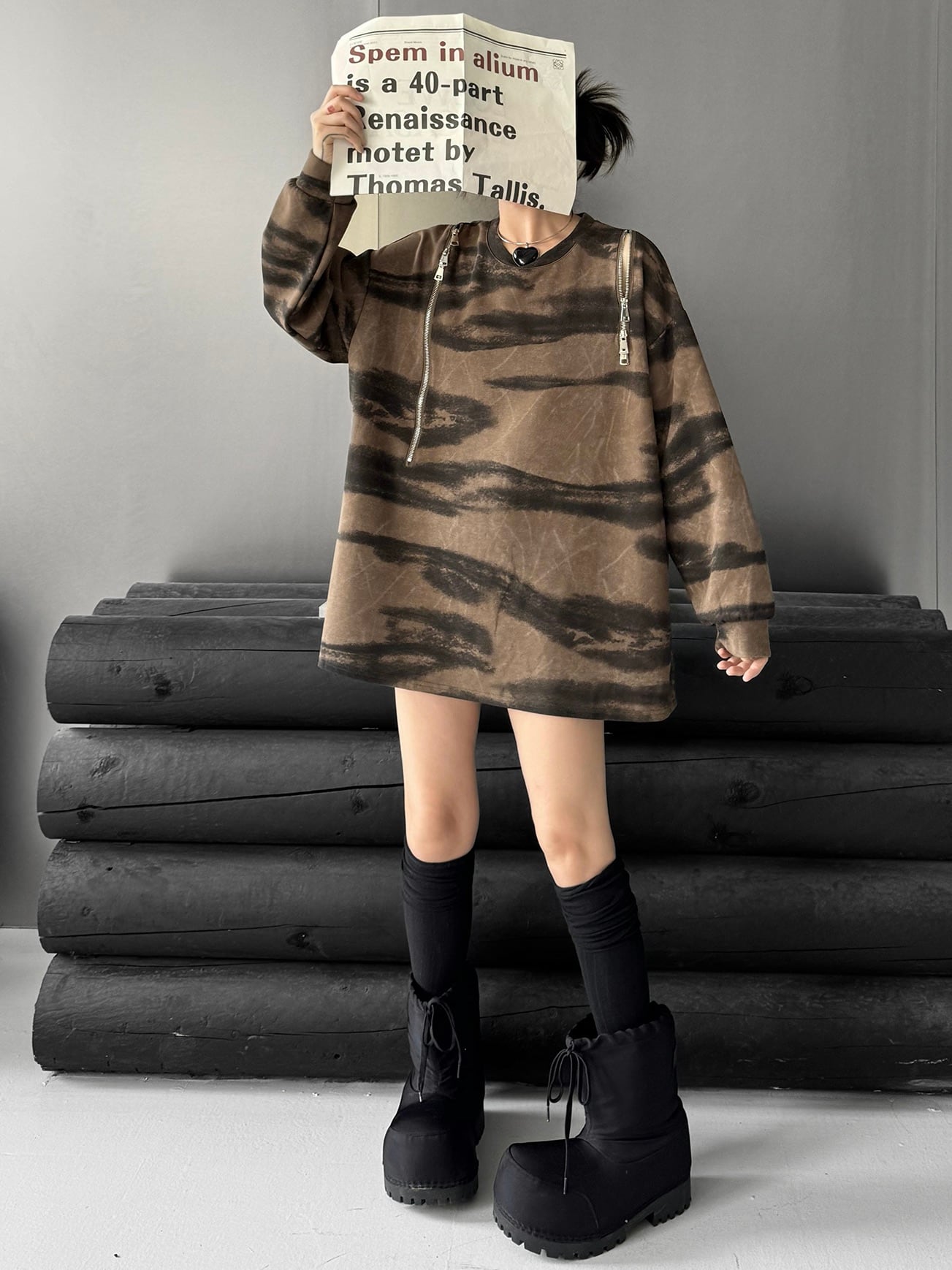 ルーズジッパープリントプルオーバー。