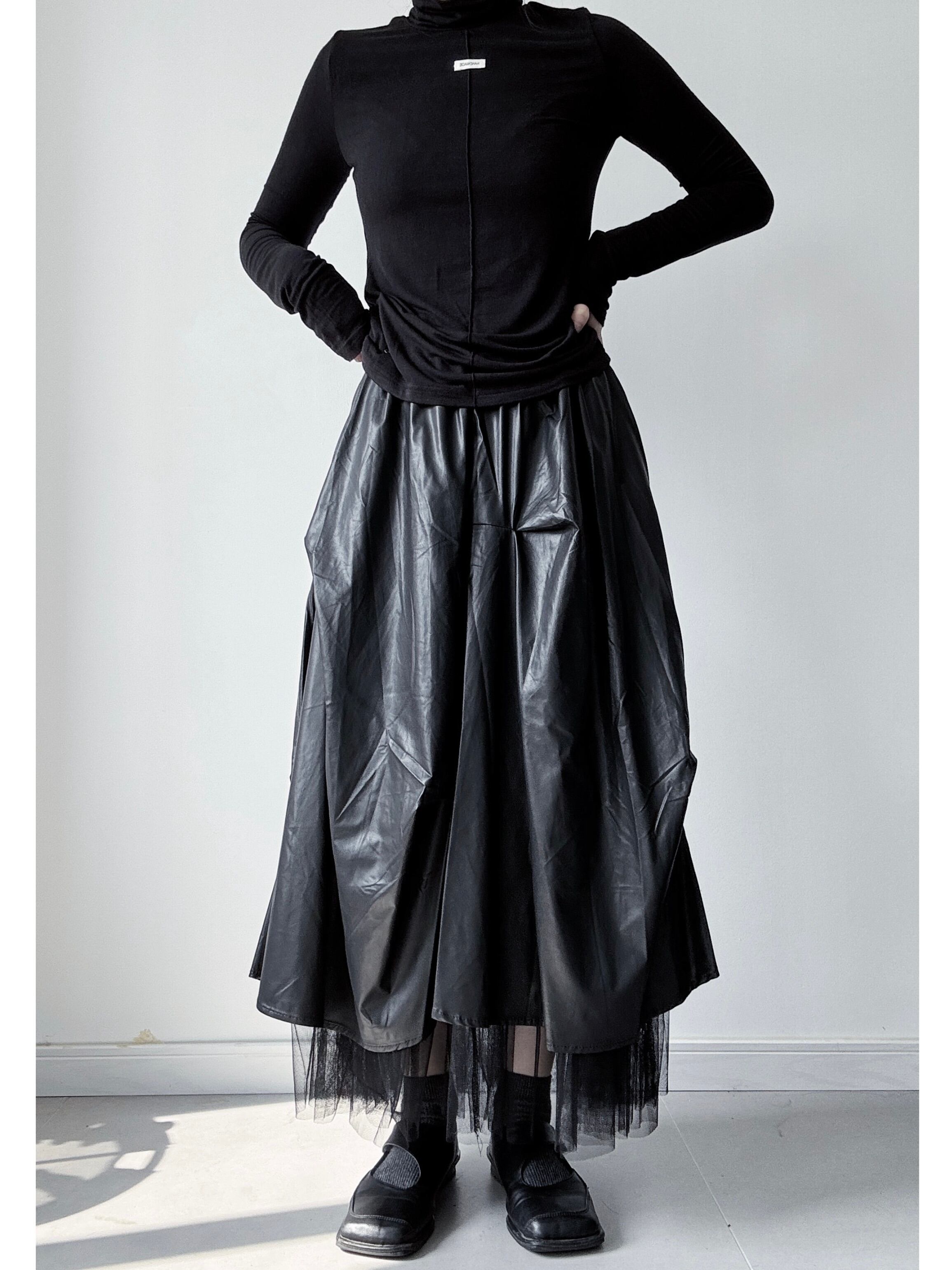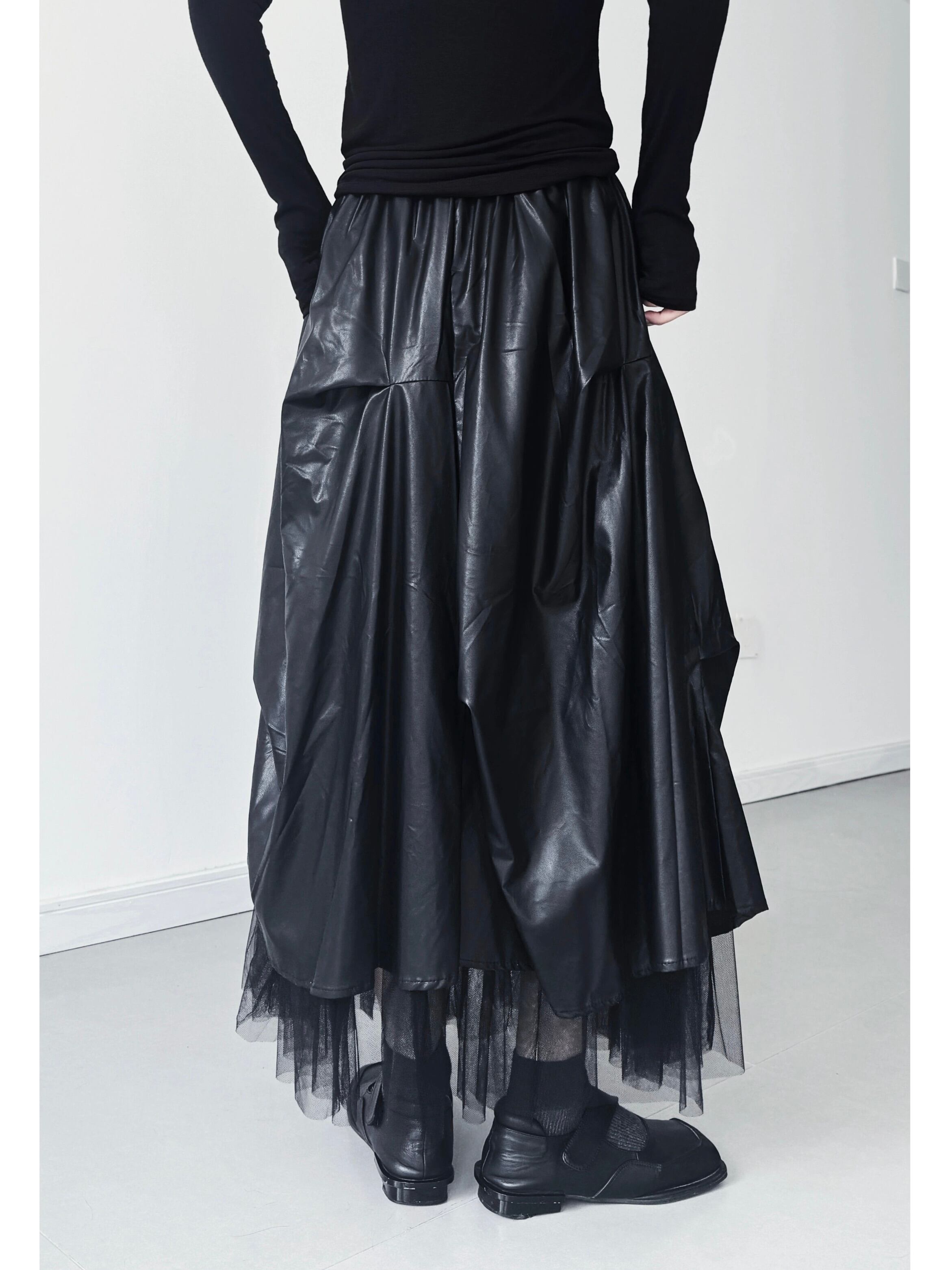 イレギュラープリーテッドPUレザーレイヤードスカート。