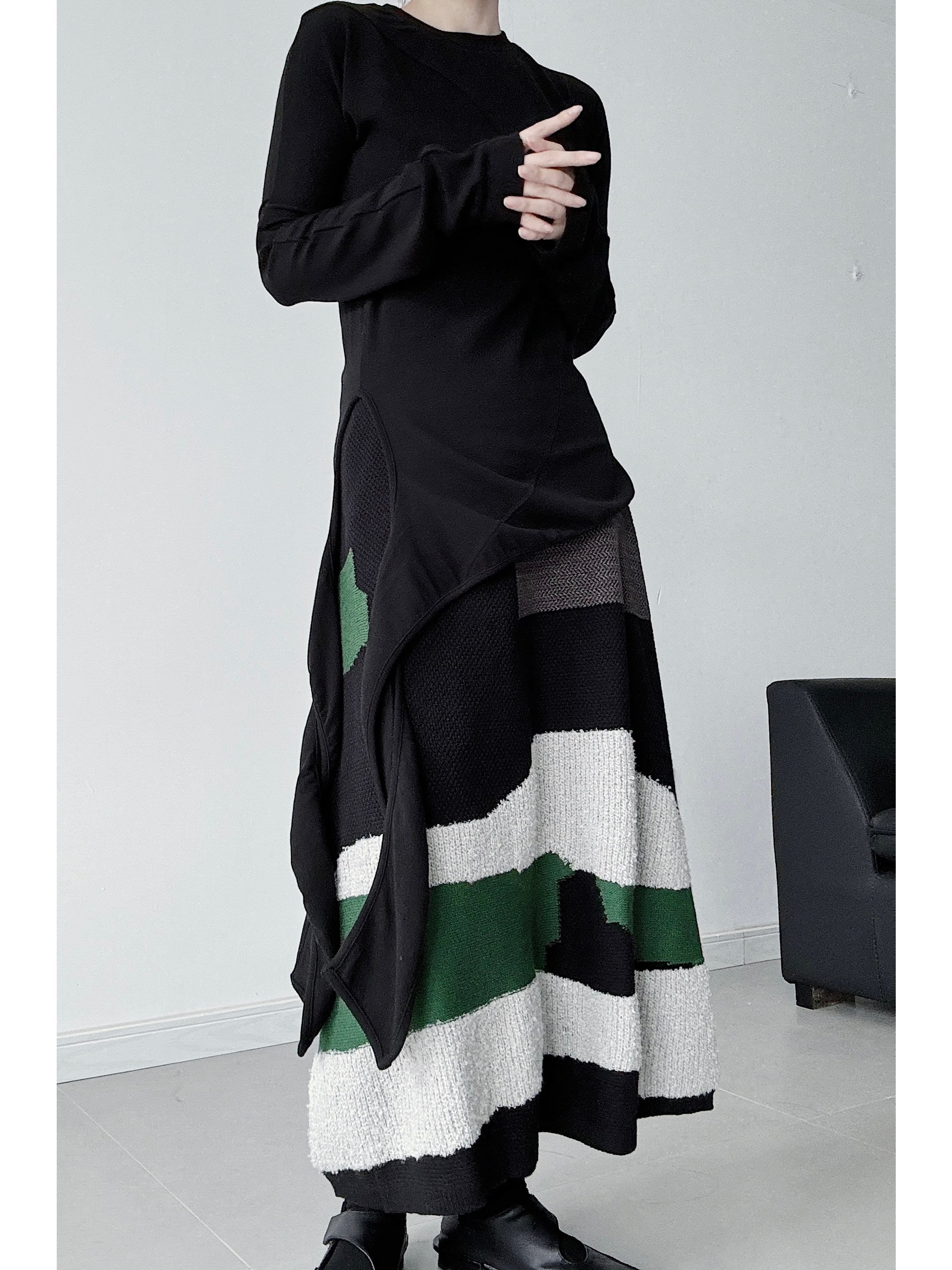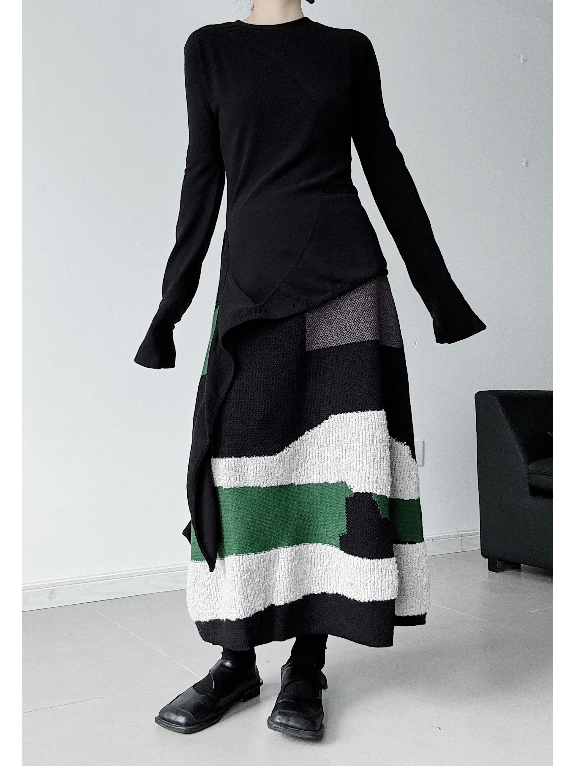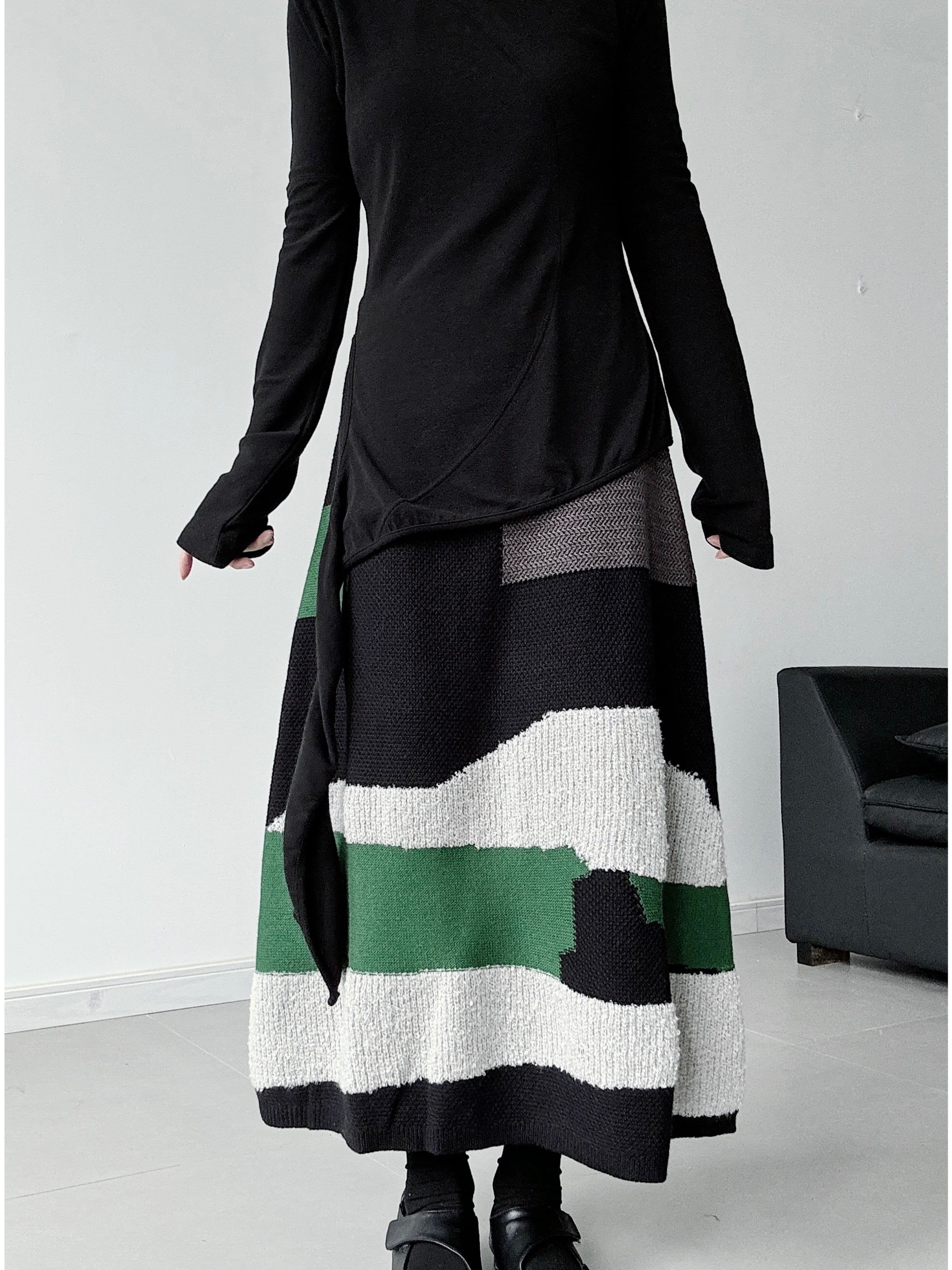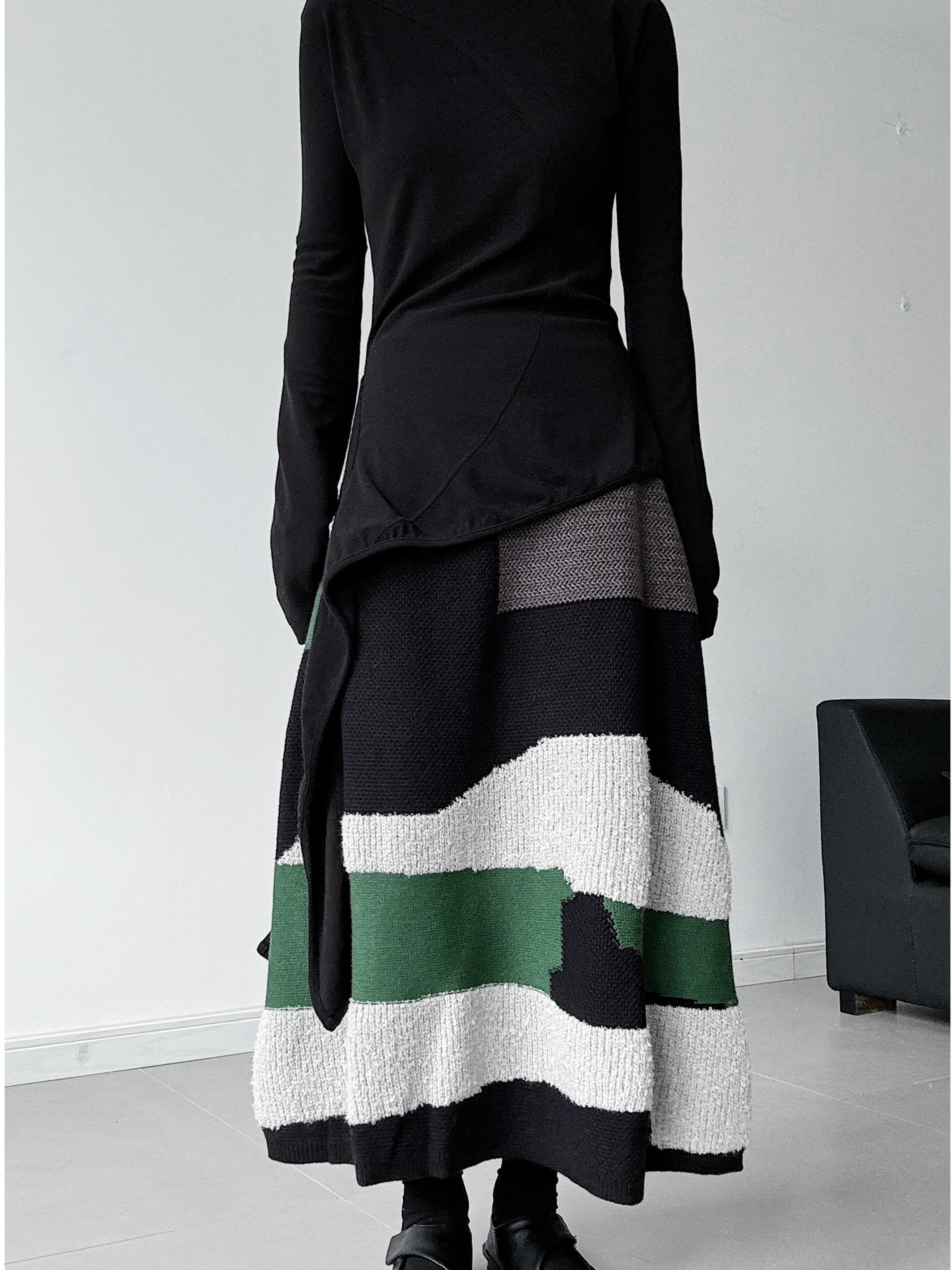 ジオメトリックストライプニットAラインスカート。