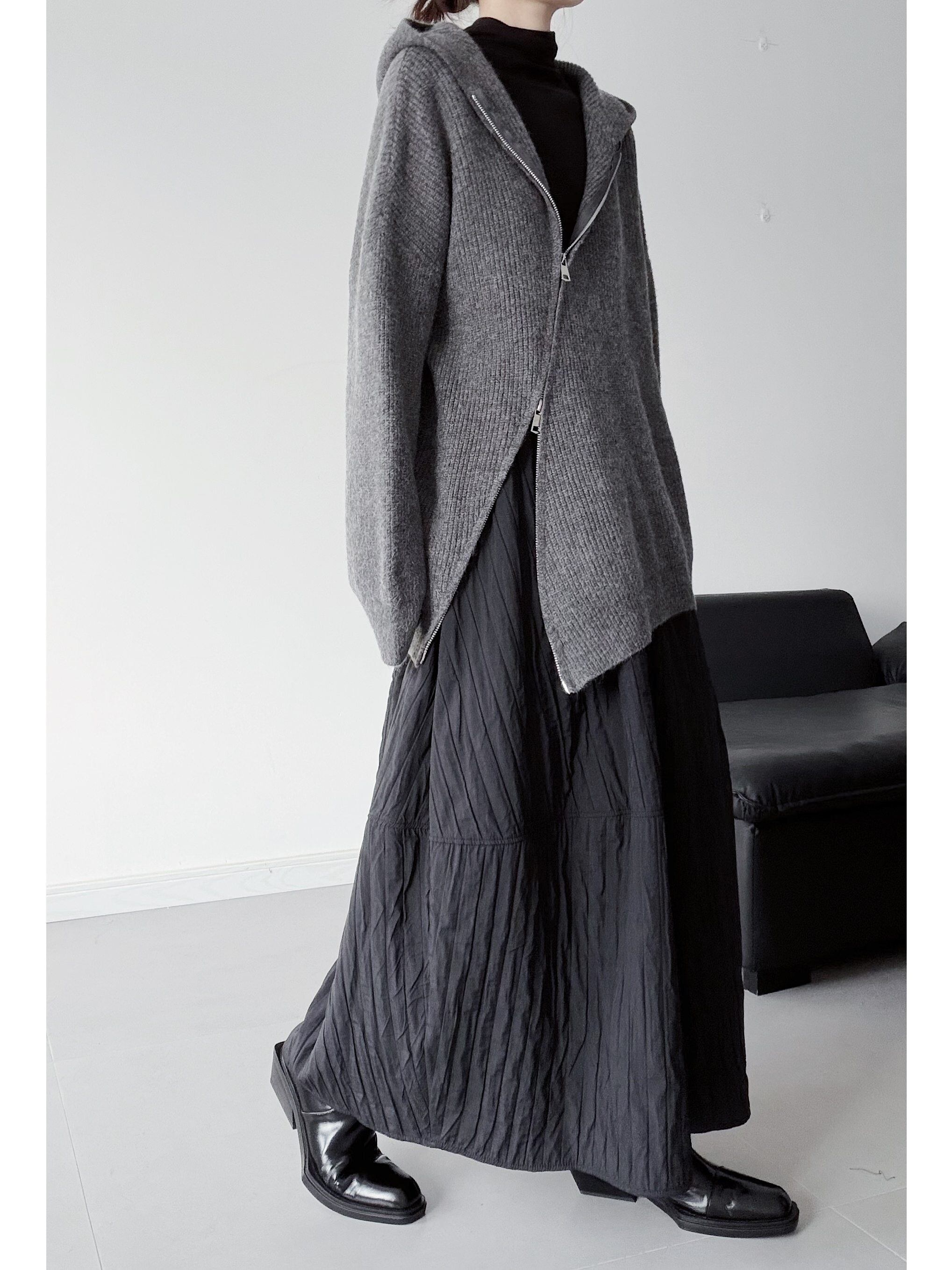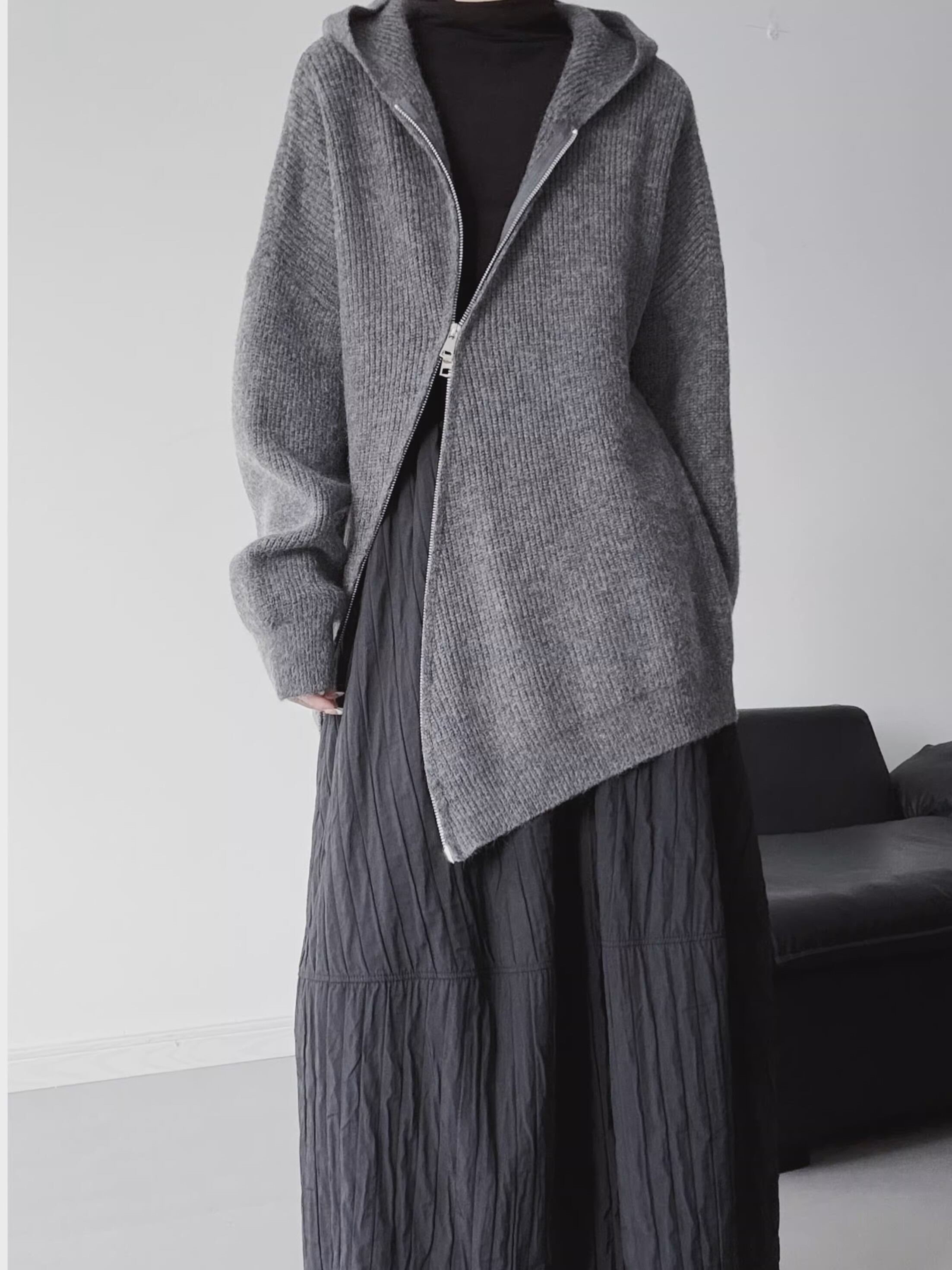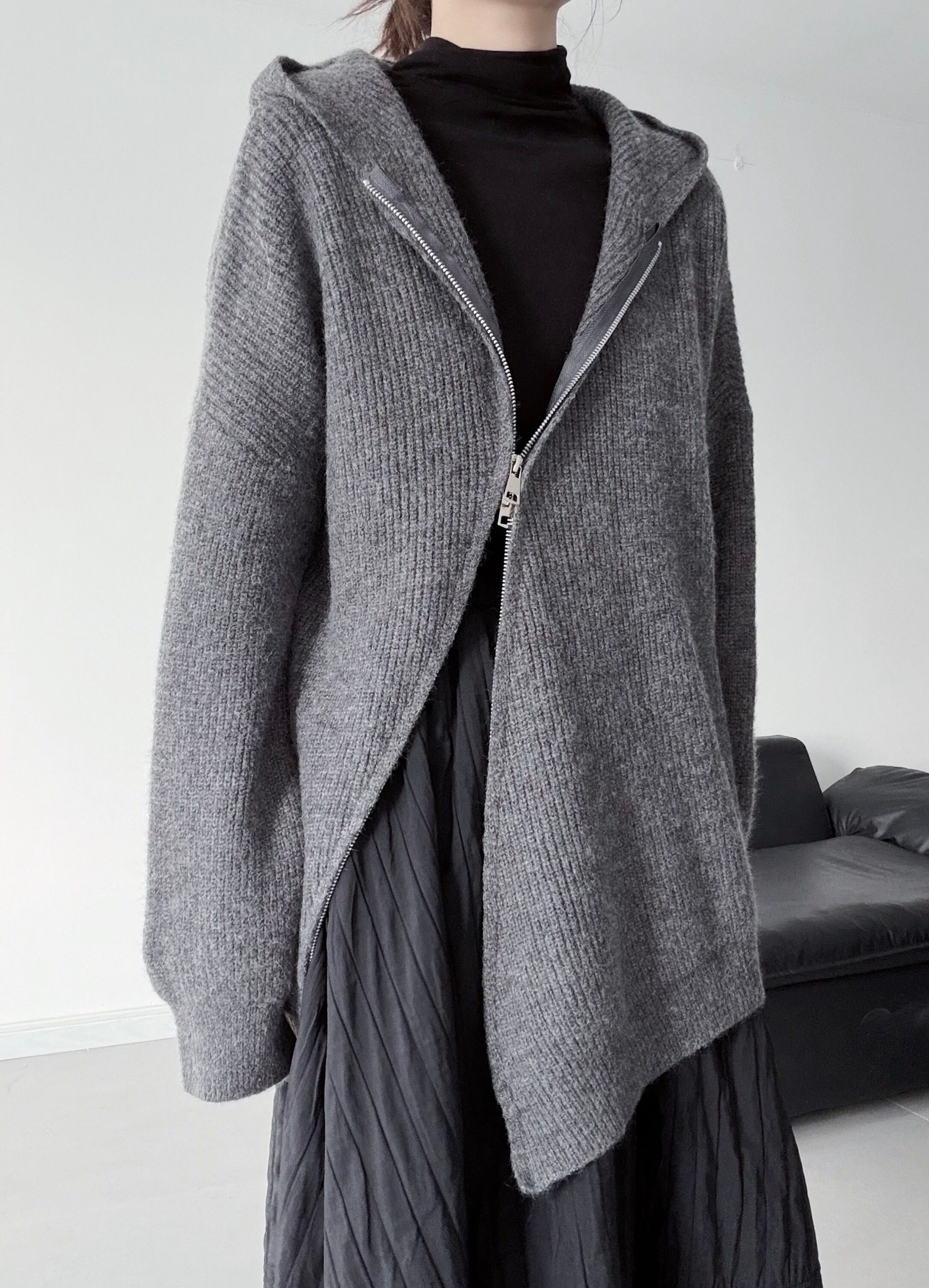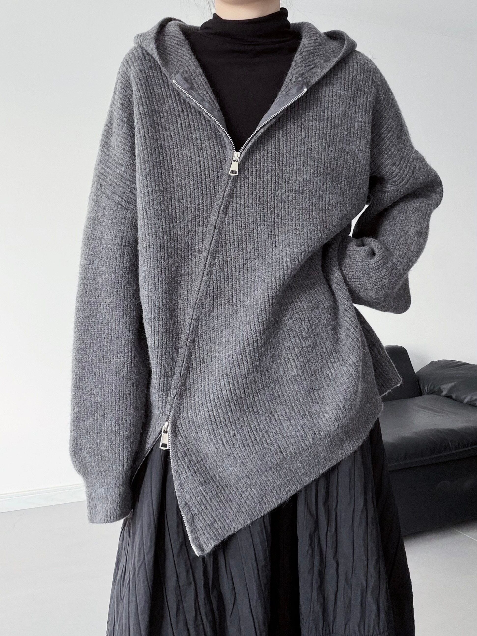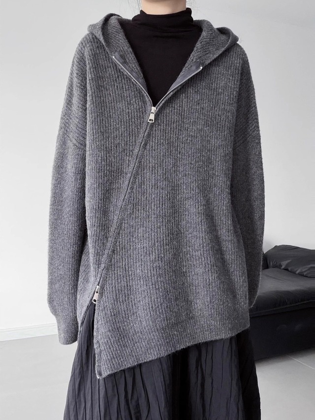 フーデッドダブルジッパールーズレイヤードグレーニット。