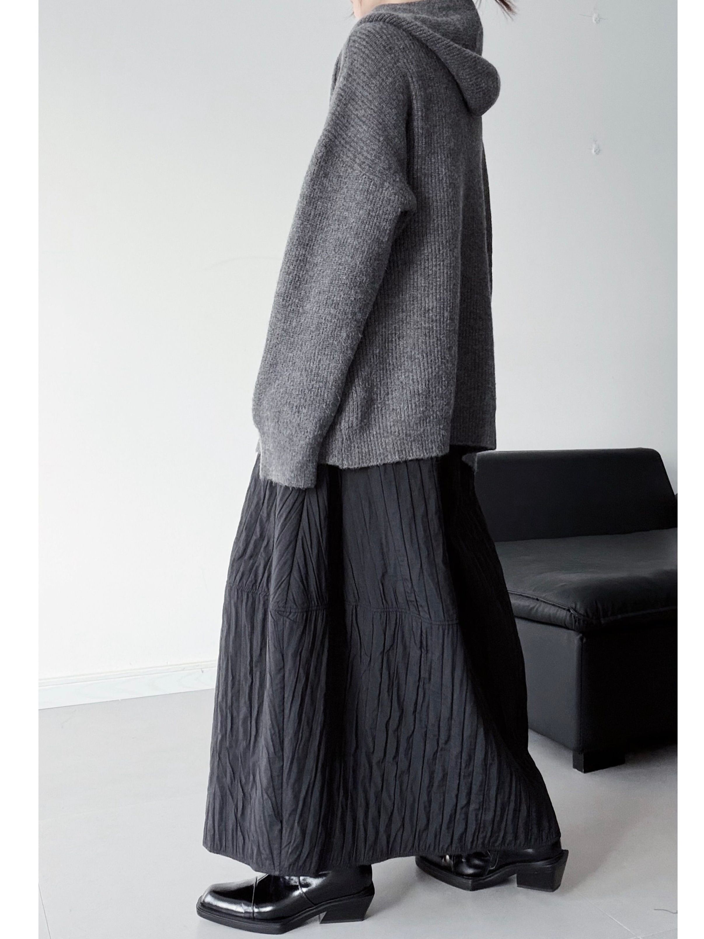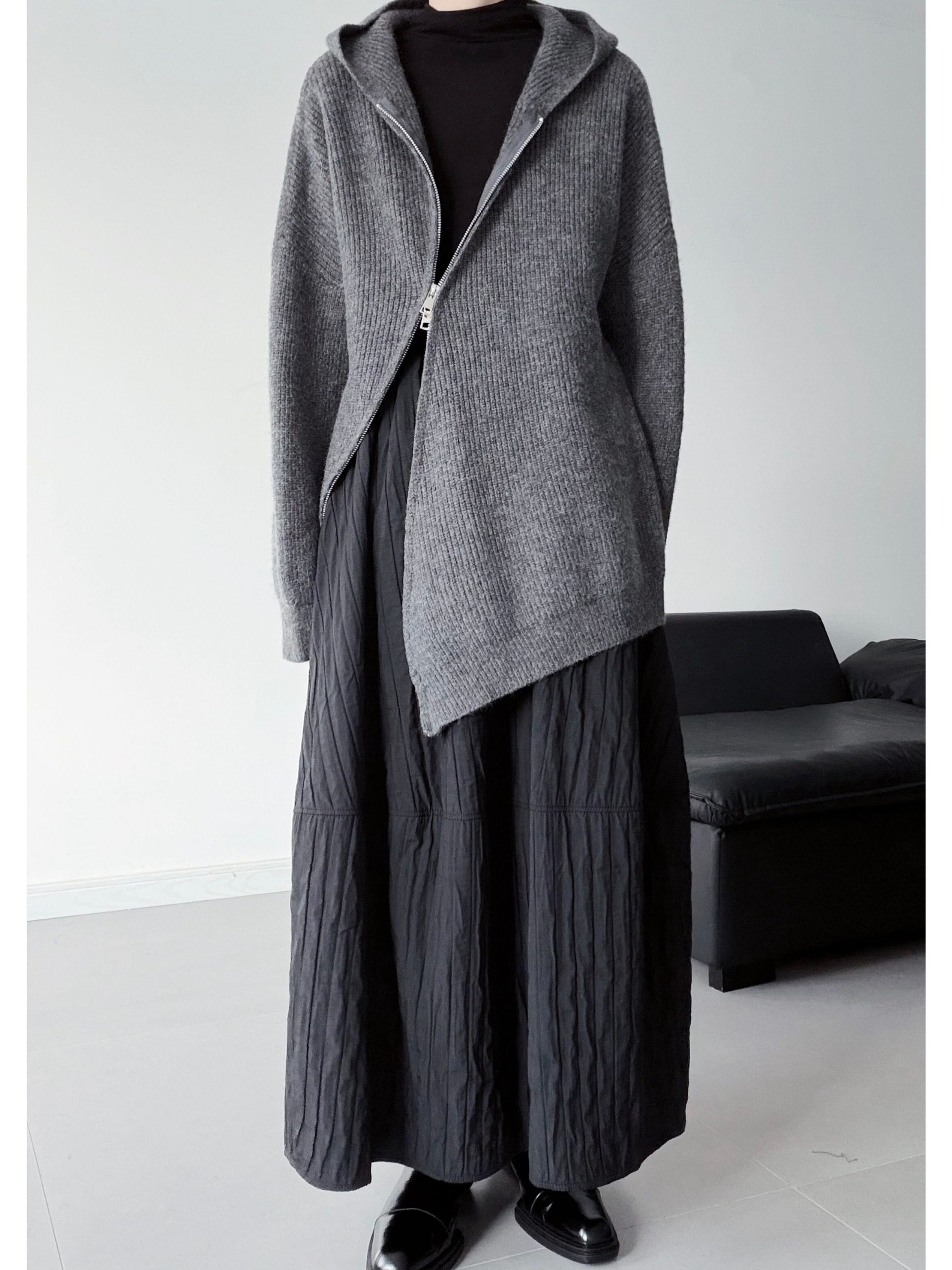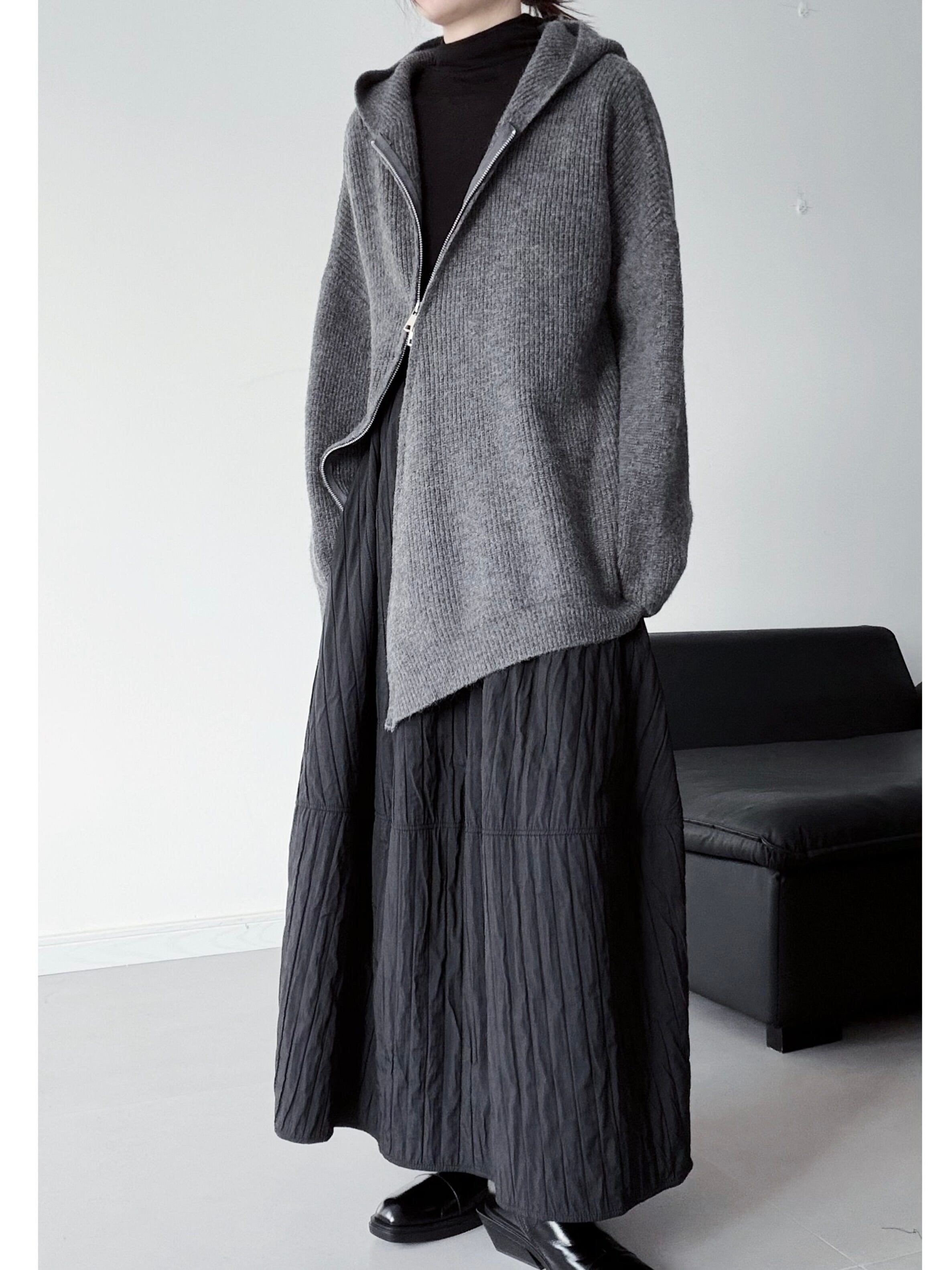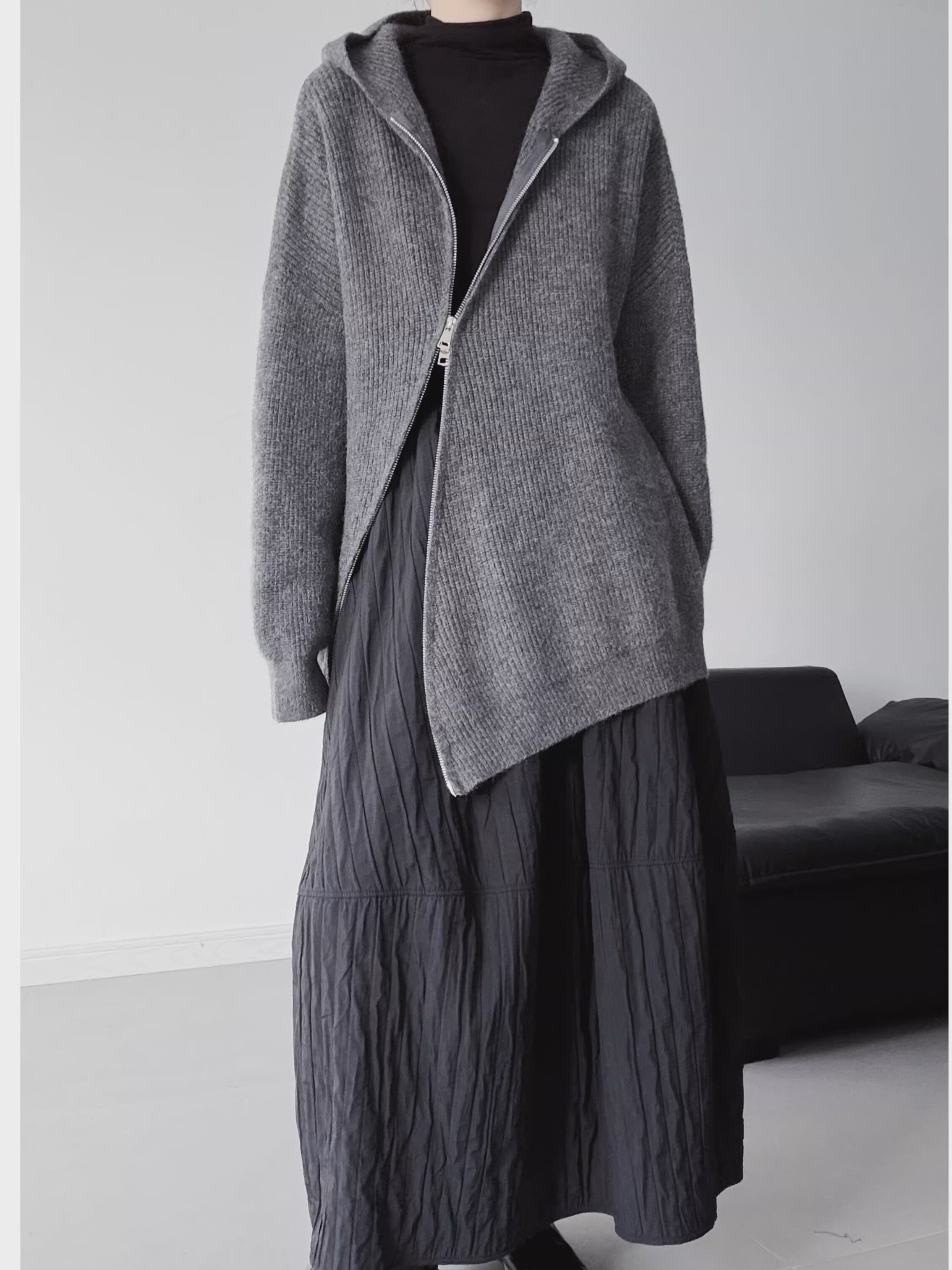 フーデッドダブルジッパールーズレイヤードグレーニット。