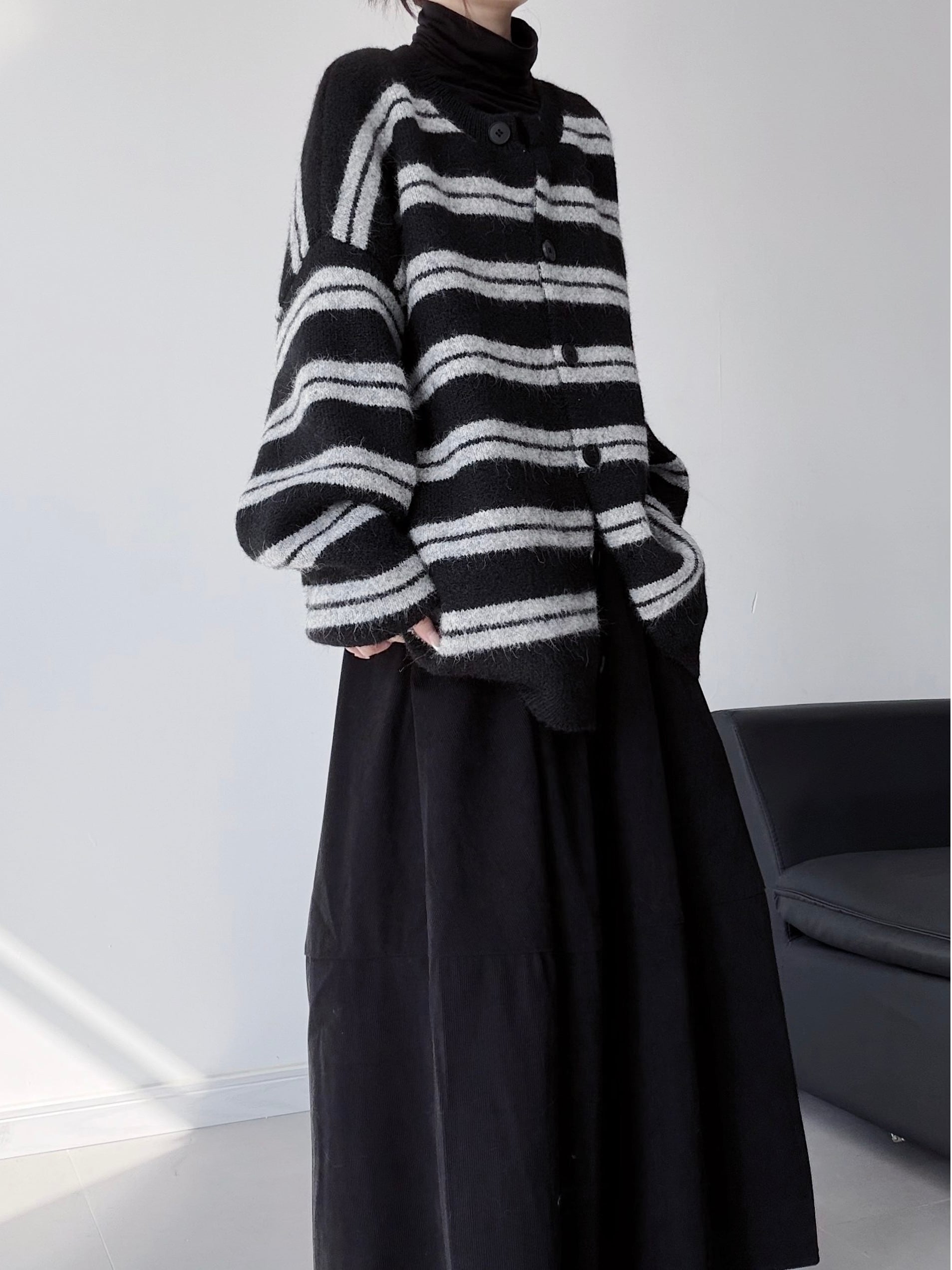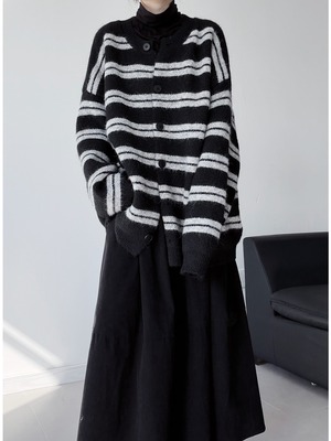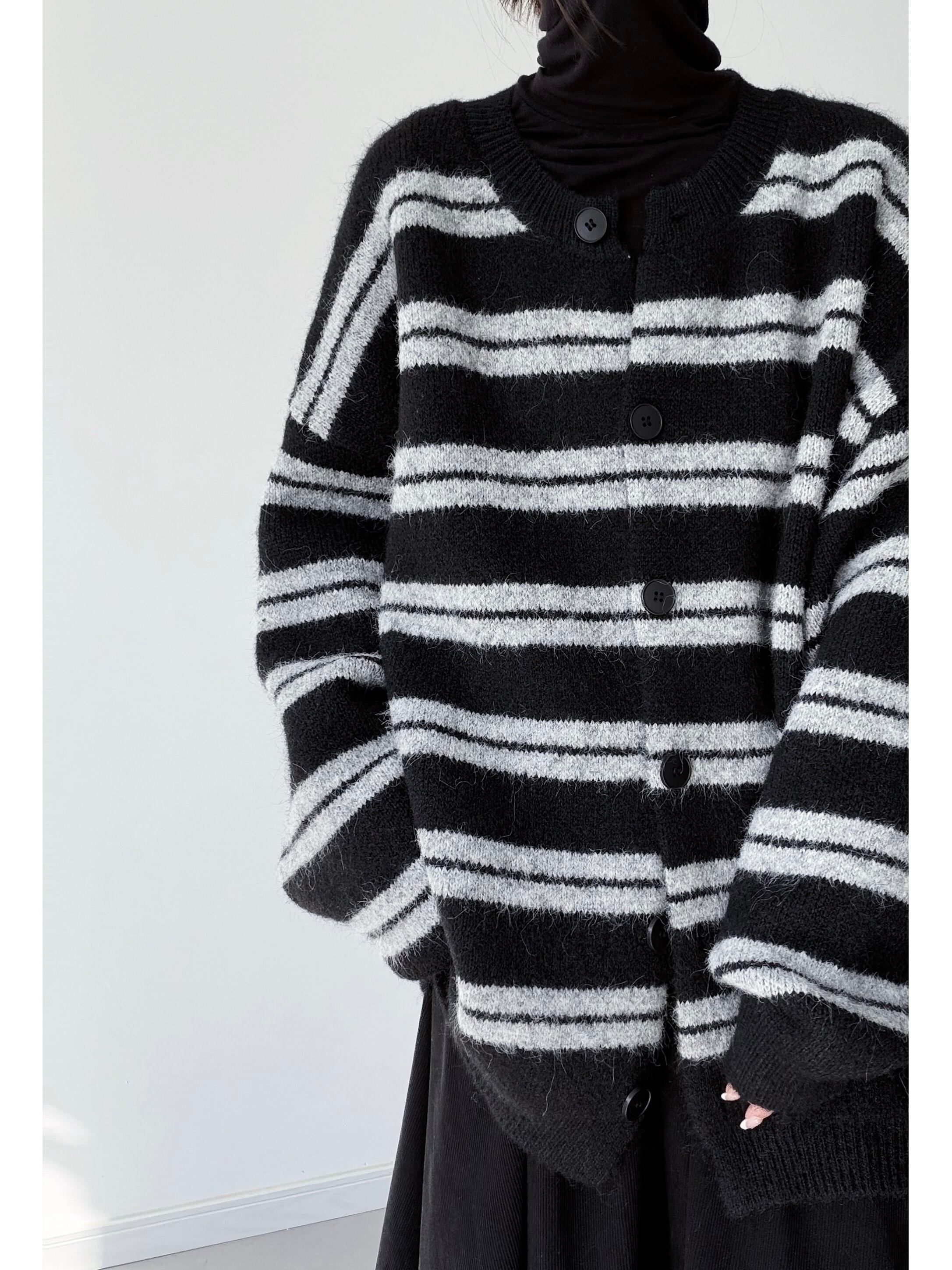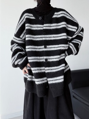 ブラックストライプルーズニットカーディガン。