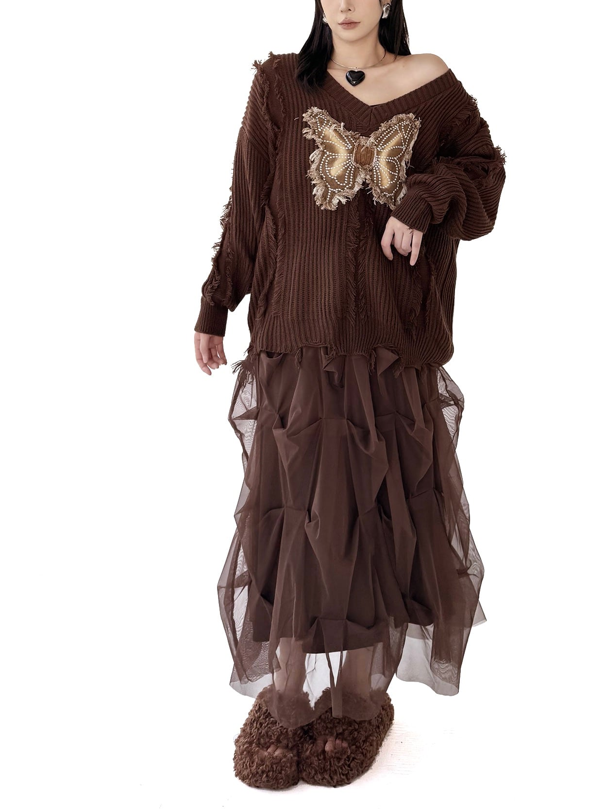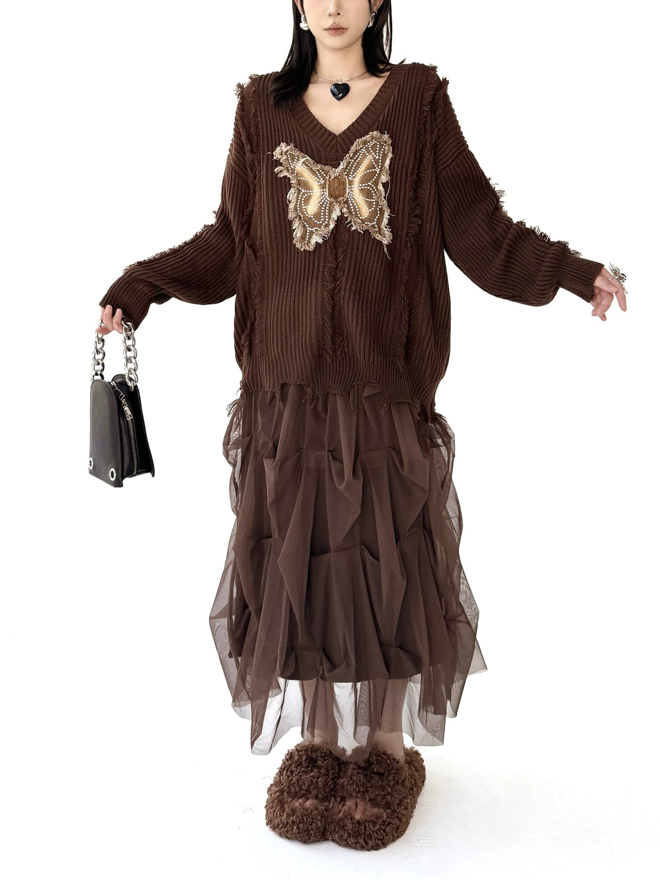 Retro butterfly appliqué V-neck loose knit [T2704]