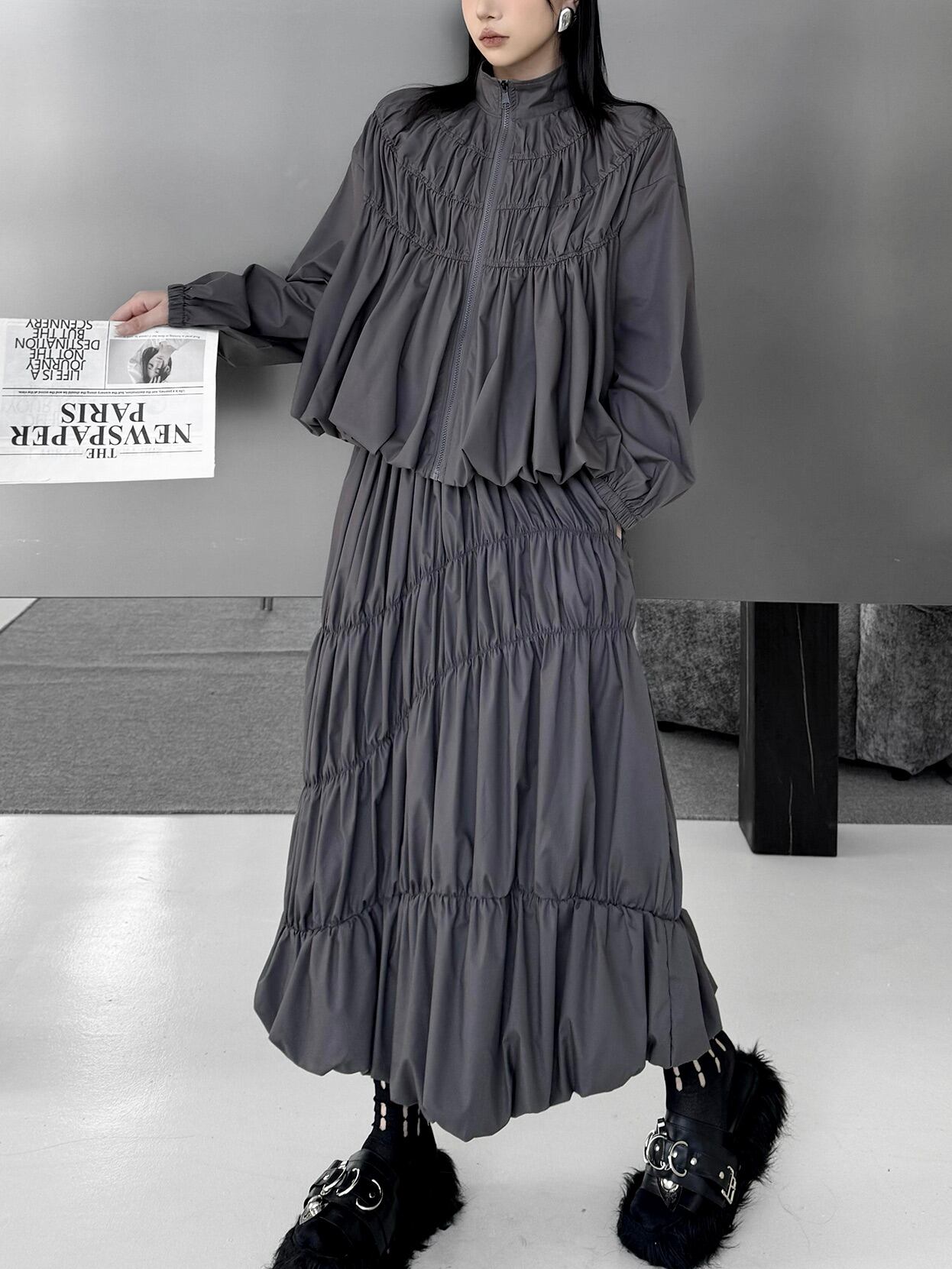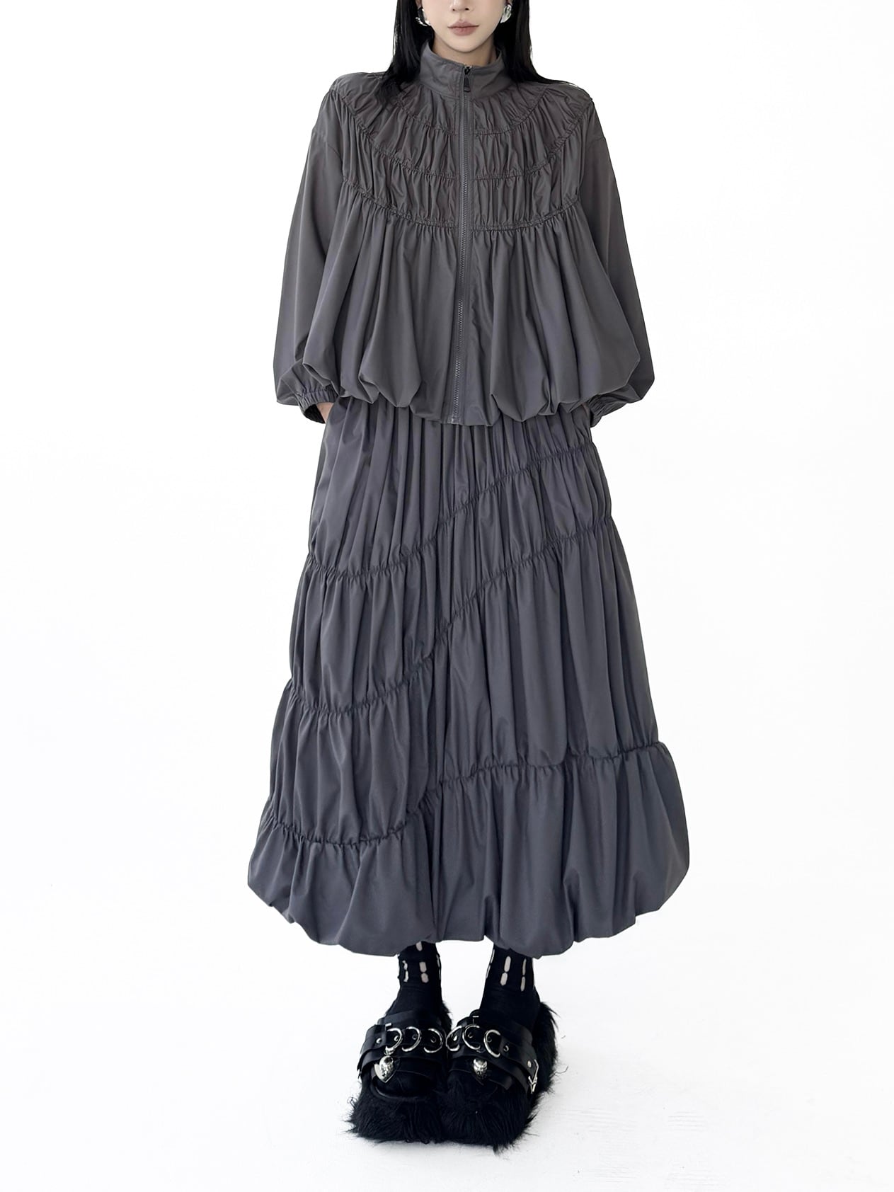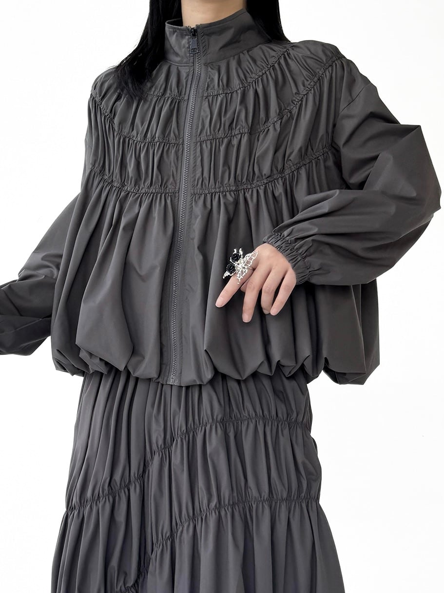 Tulip-shaped pleated stand-collar zipper shirt 2color [T2706]
