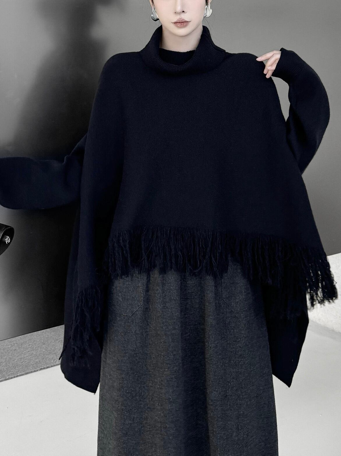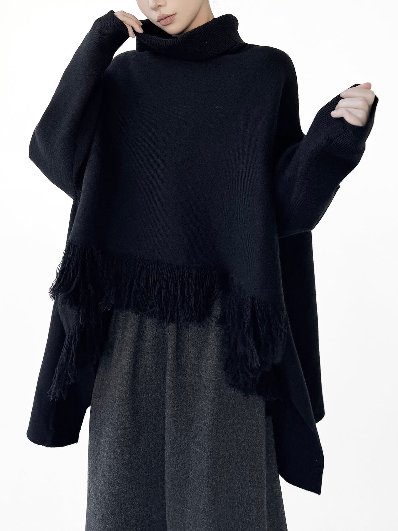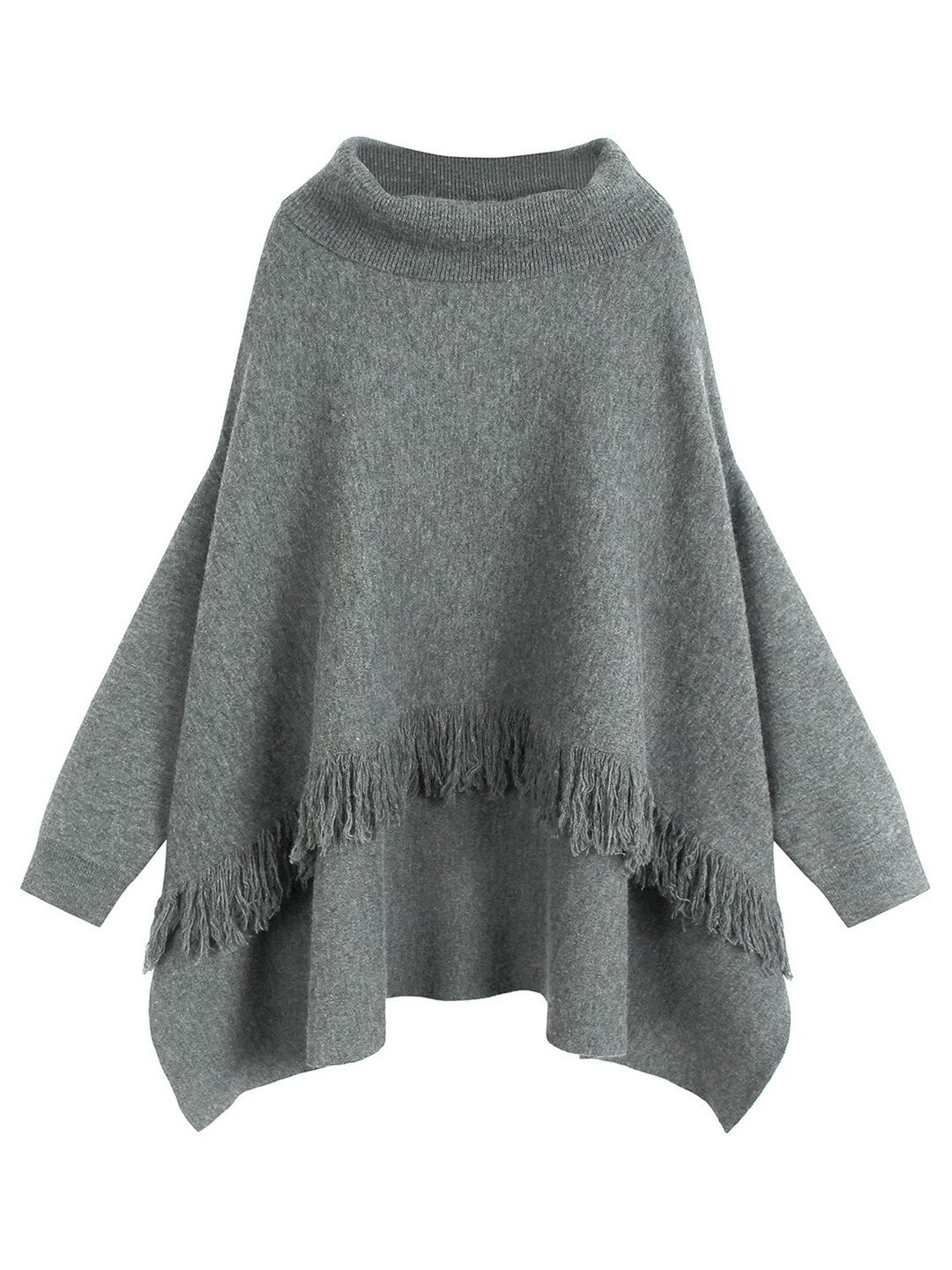 ハイネックタッセルケープニット。