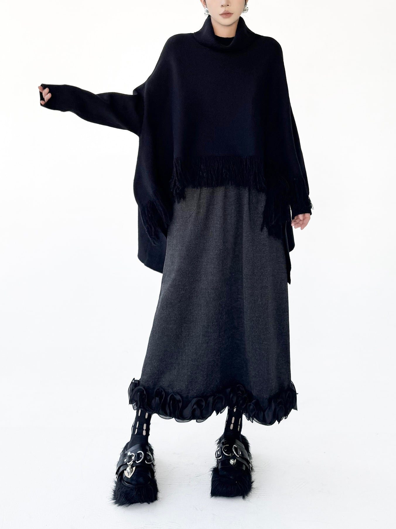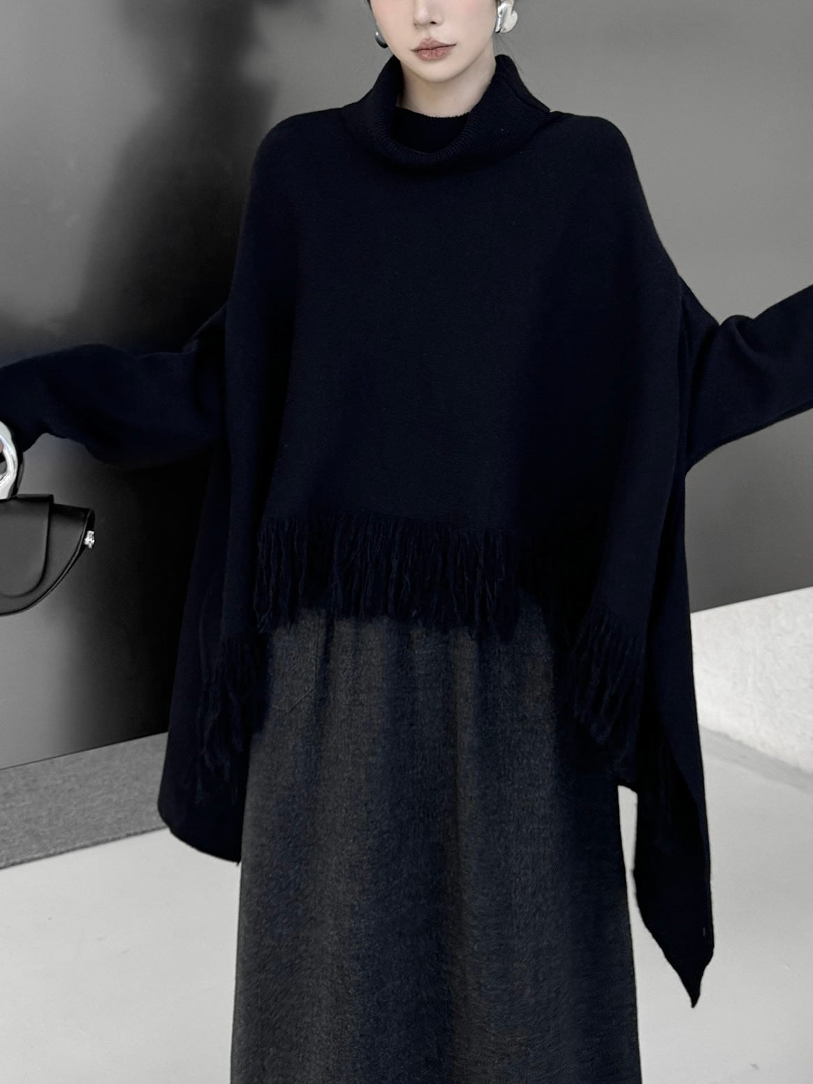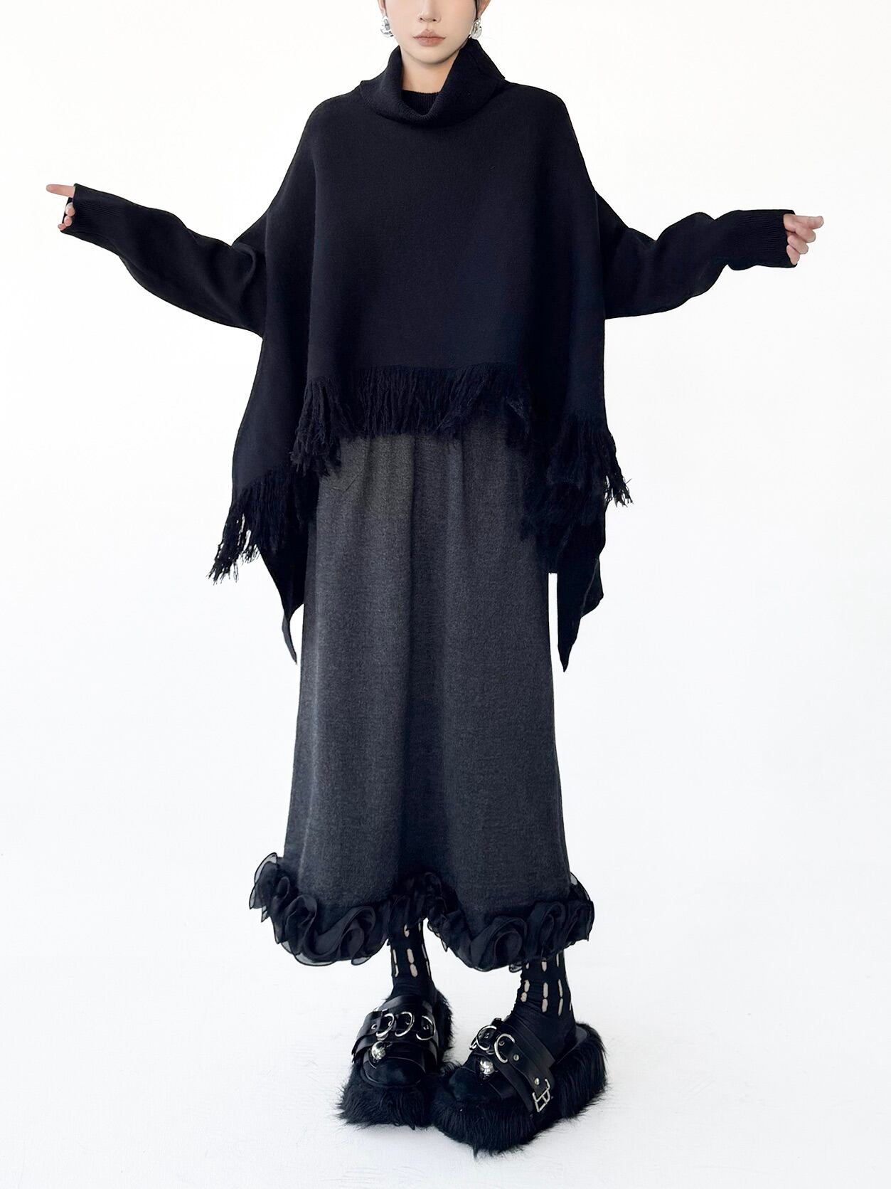 ハイネックタッセルケープニット。