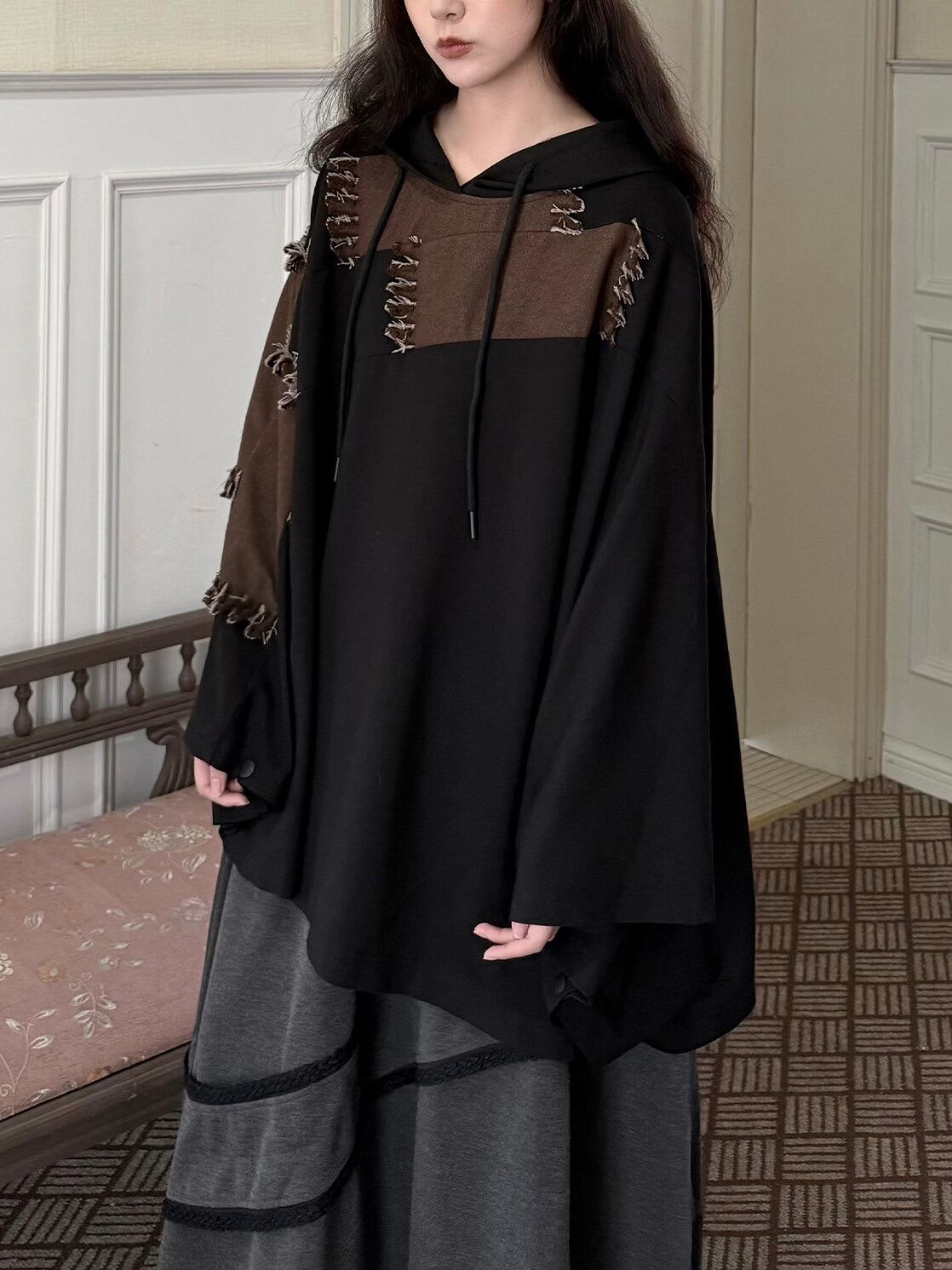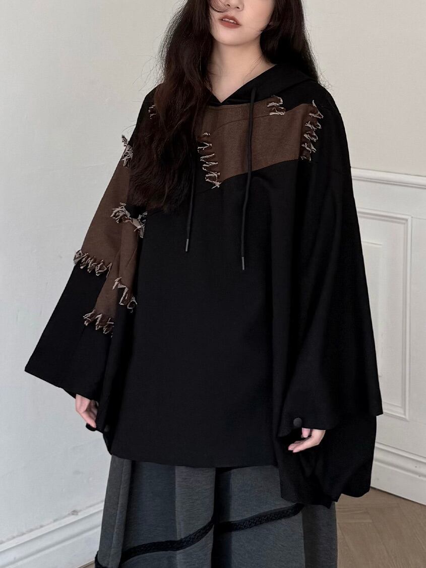 Distressed loose hooded pullover cape coat [T2763]