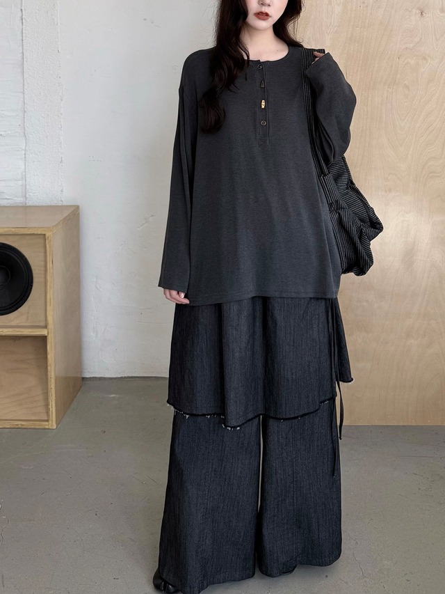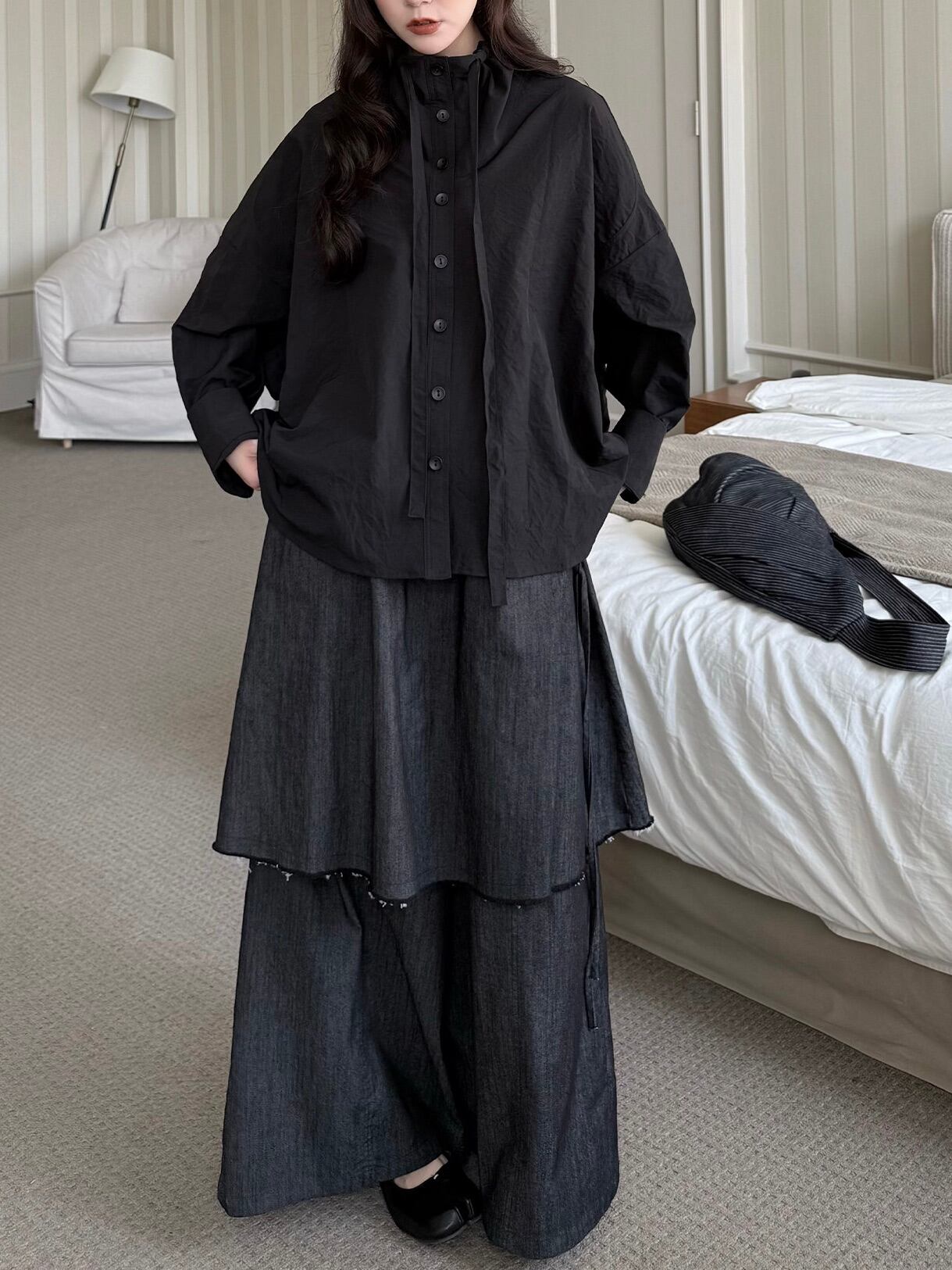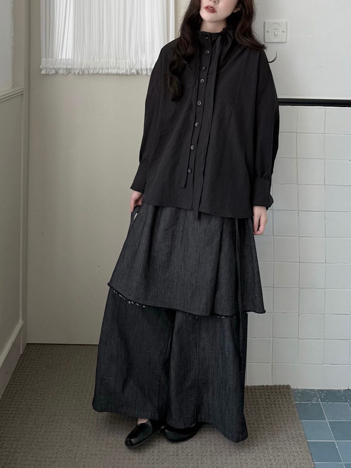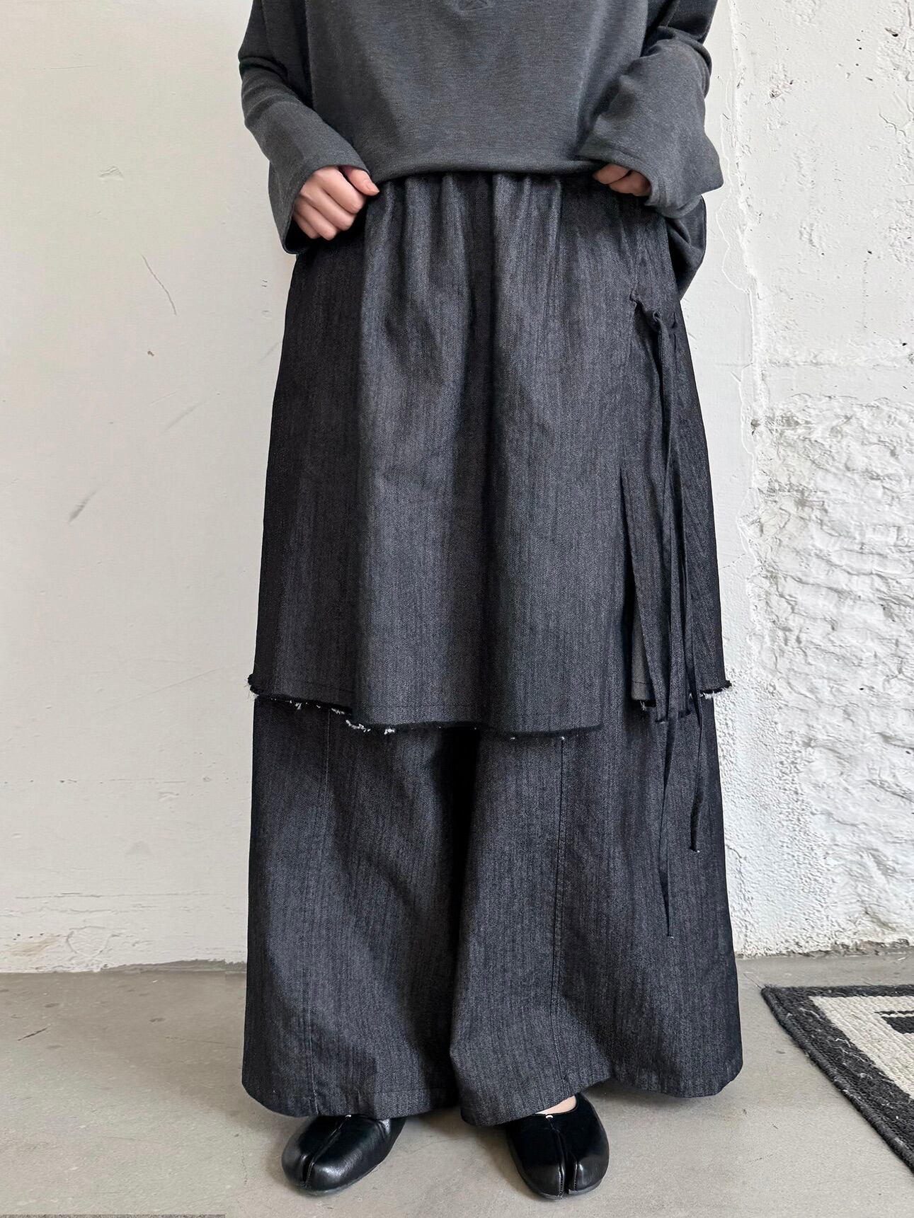 アシンメトリーレイヤードスカートパンツ。