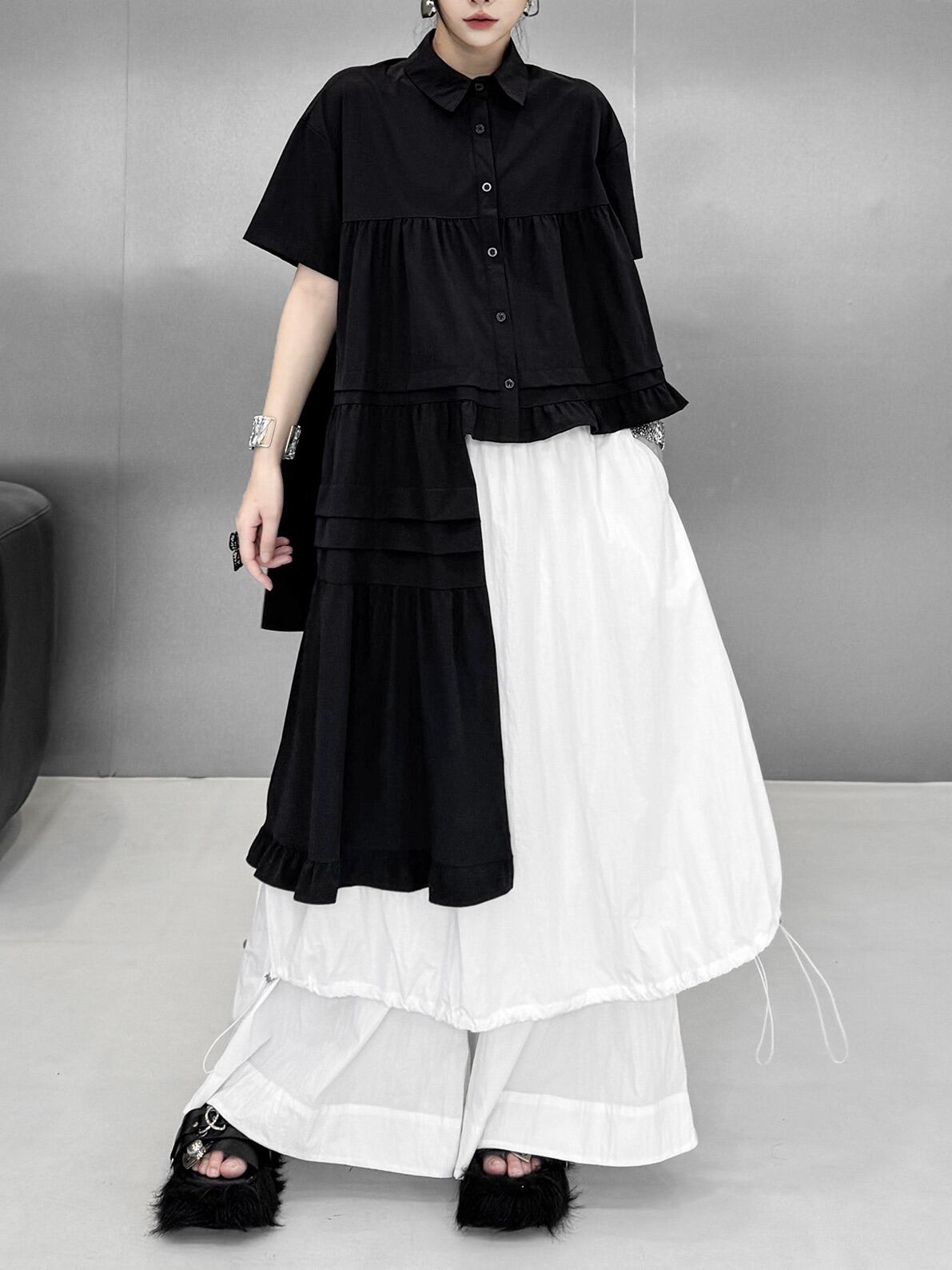 アシンメトリーラッフルヘムショートスリーブシャツ。