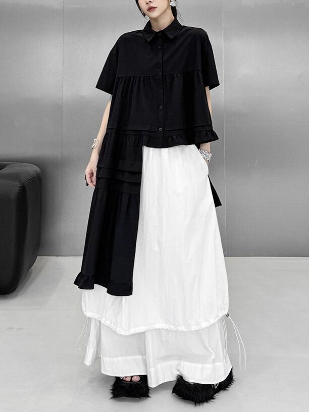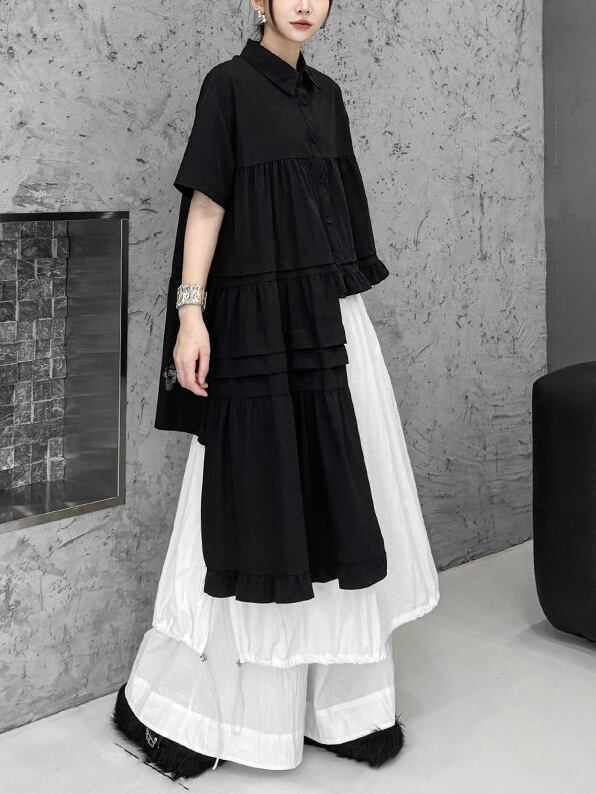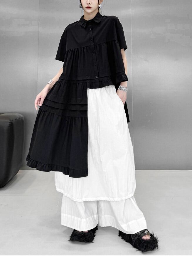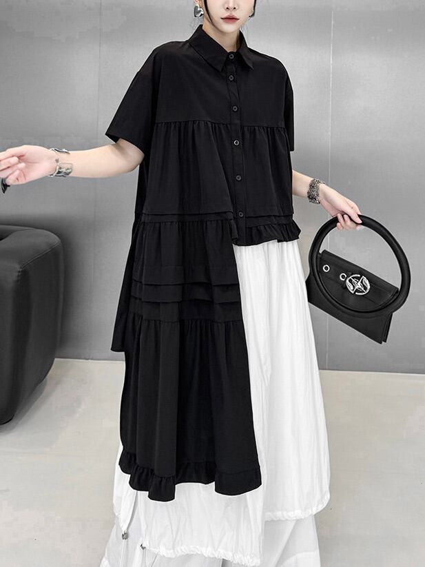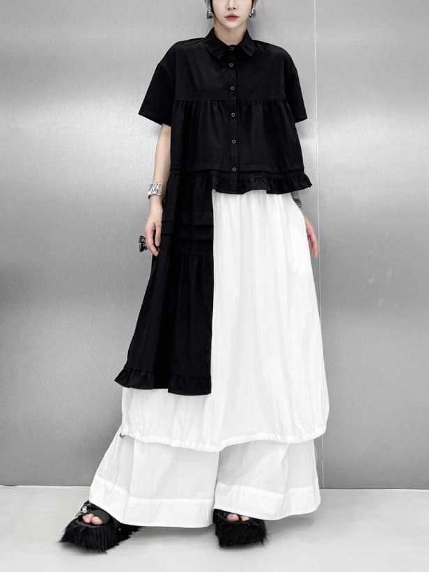 Asymmetric ruffle hem short sleeve shirt [T2817]