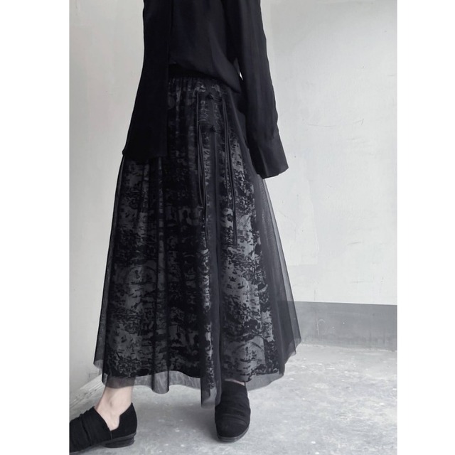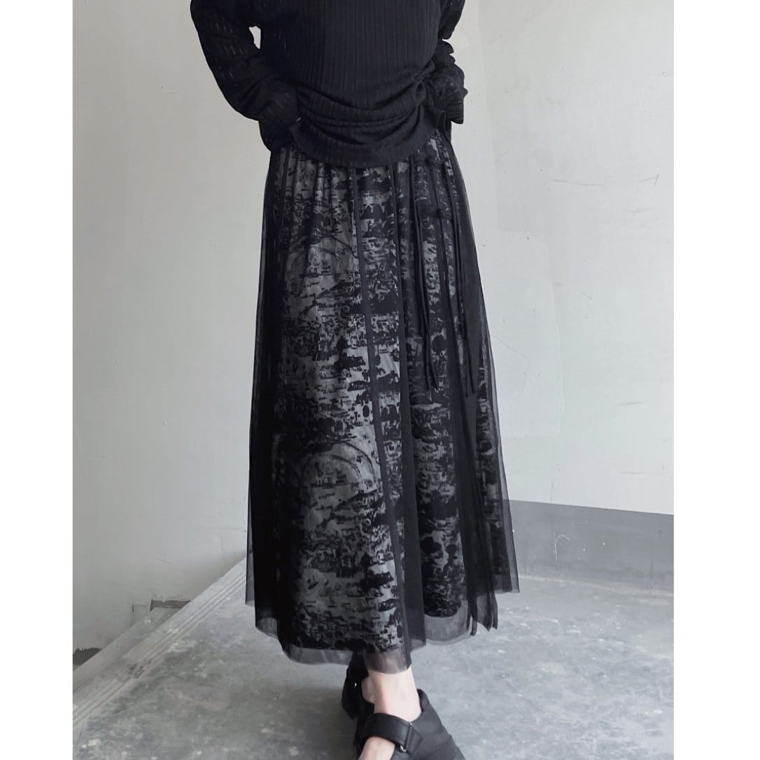 アート柄レイヤーチュールスリットスカート。