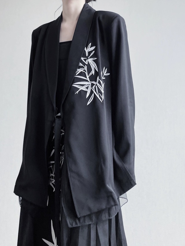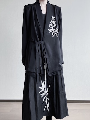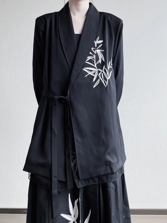 胸元の竹の葉の刺しゅうとカシュクールデザインが目を引くアイテム。