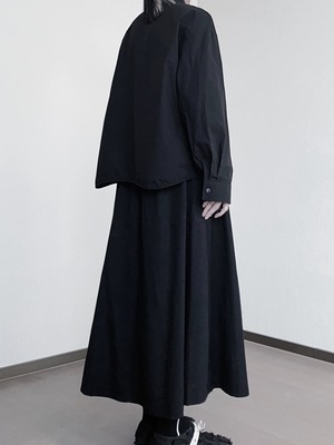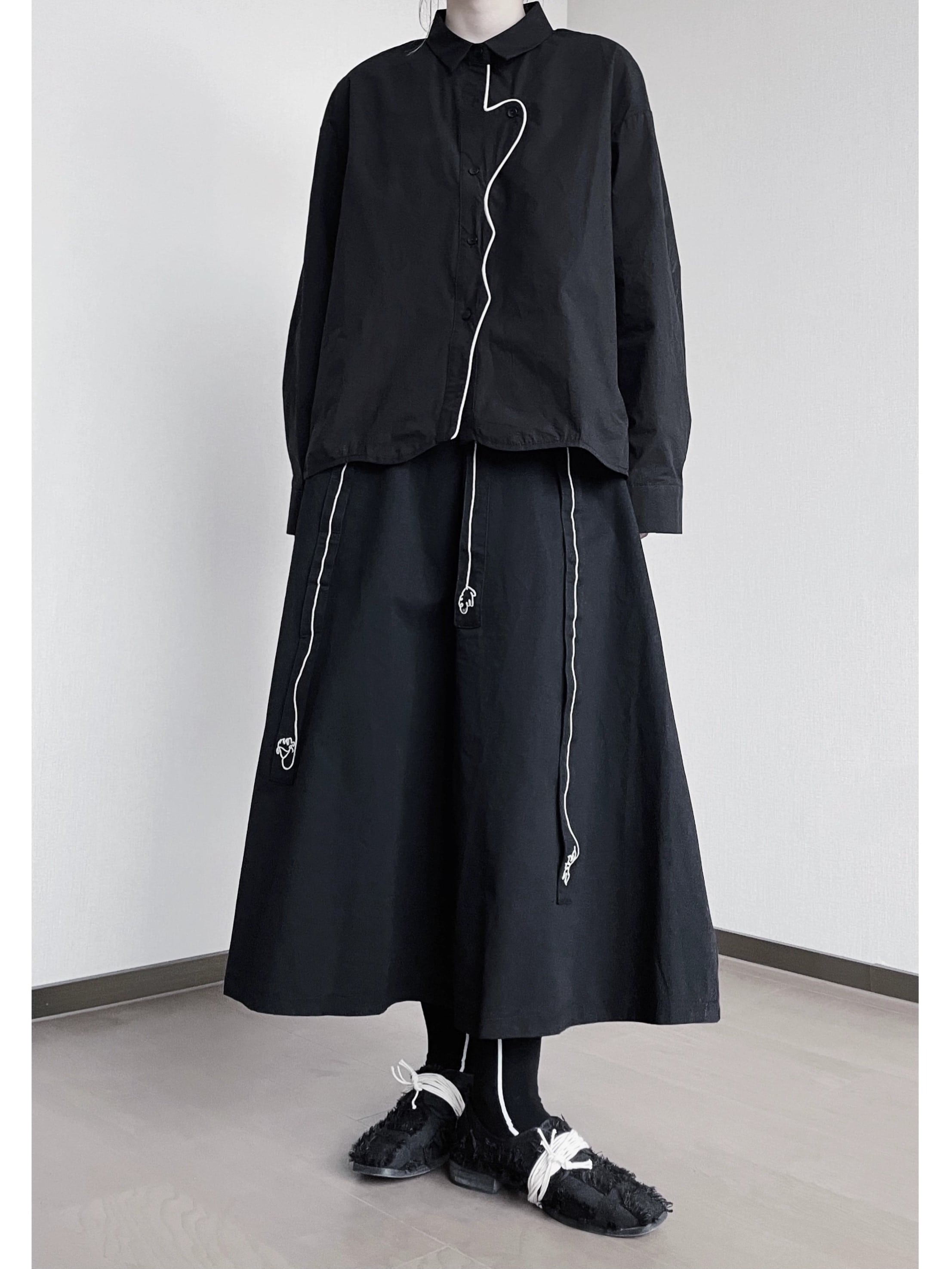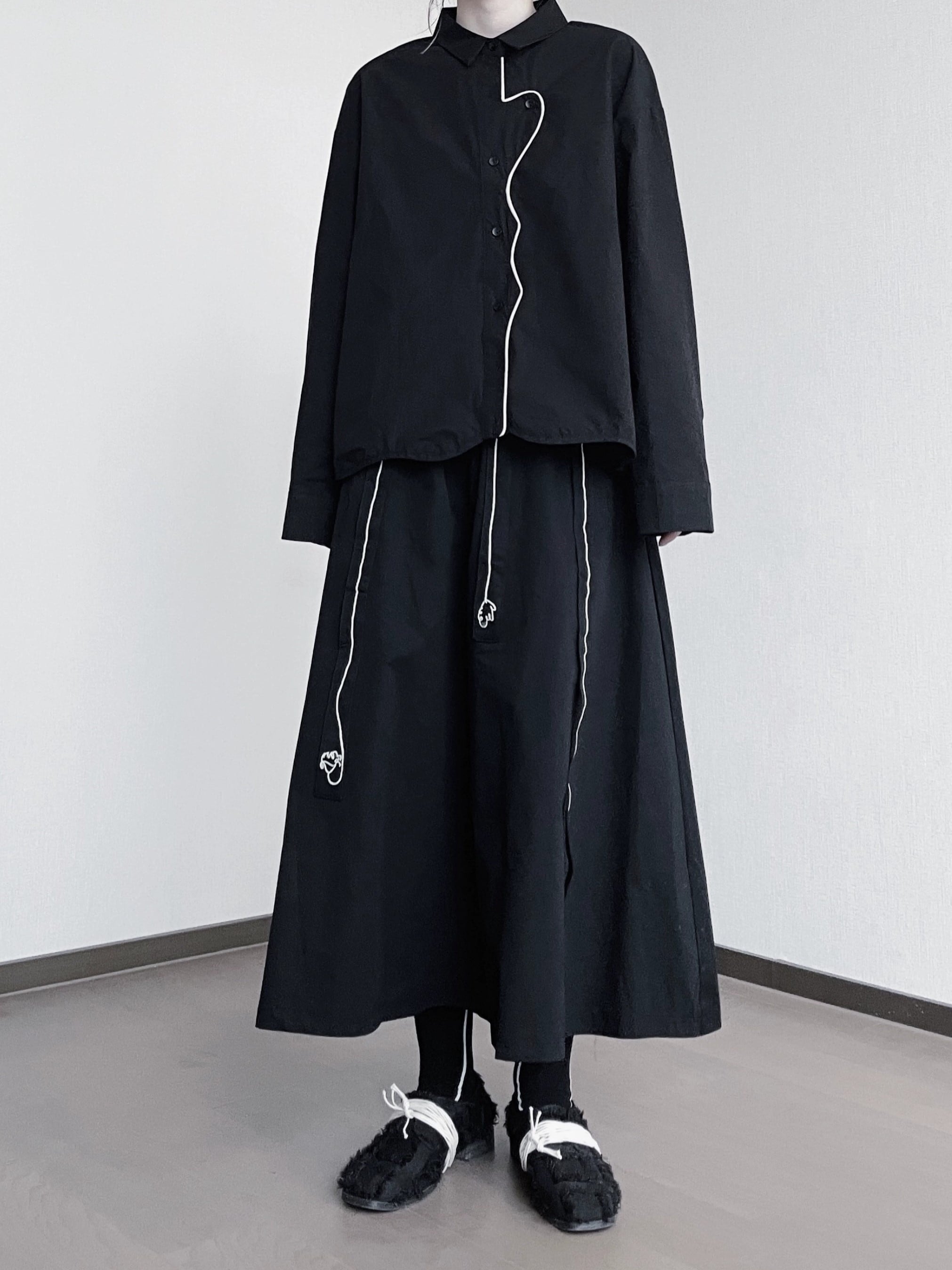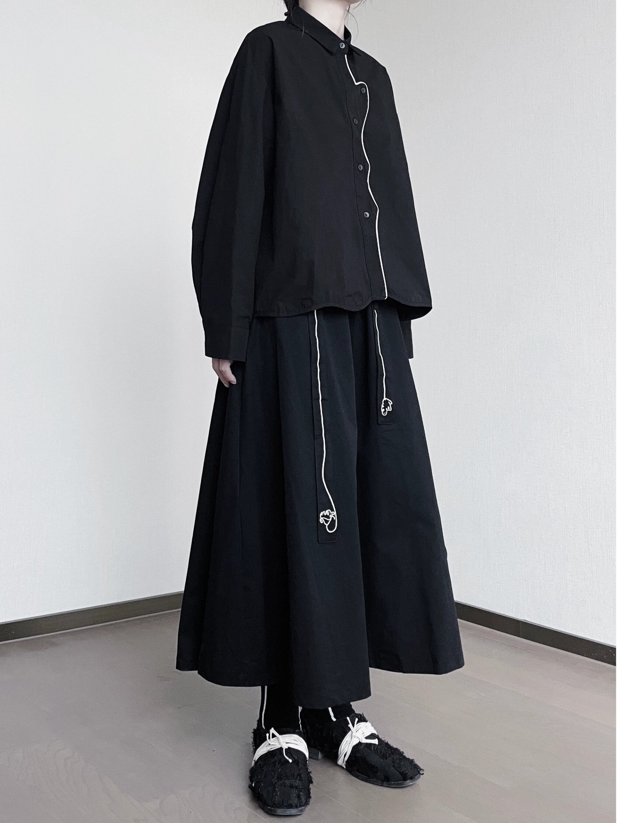 シャツの胸元から延びるワンラインの刺繍がアクセントとなり、個性的な印象を与えます。
