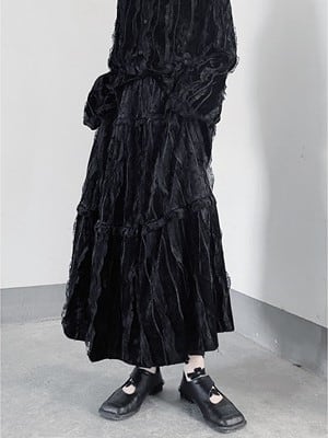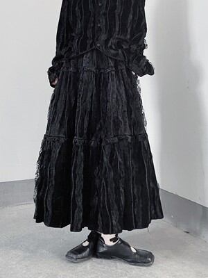 モード感溢れるベルべットとレースの異素材ドッキングスカート。