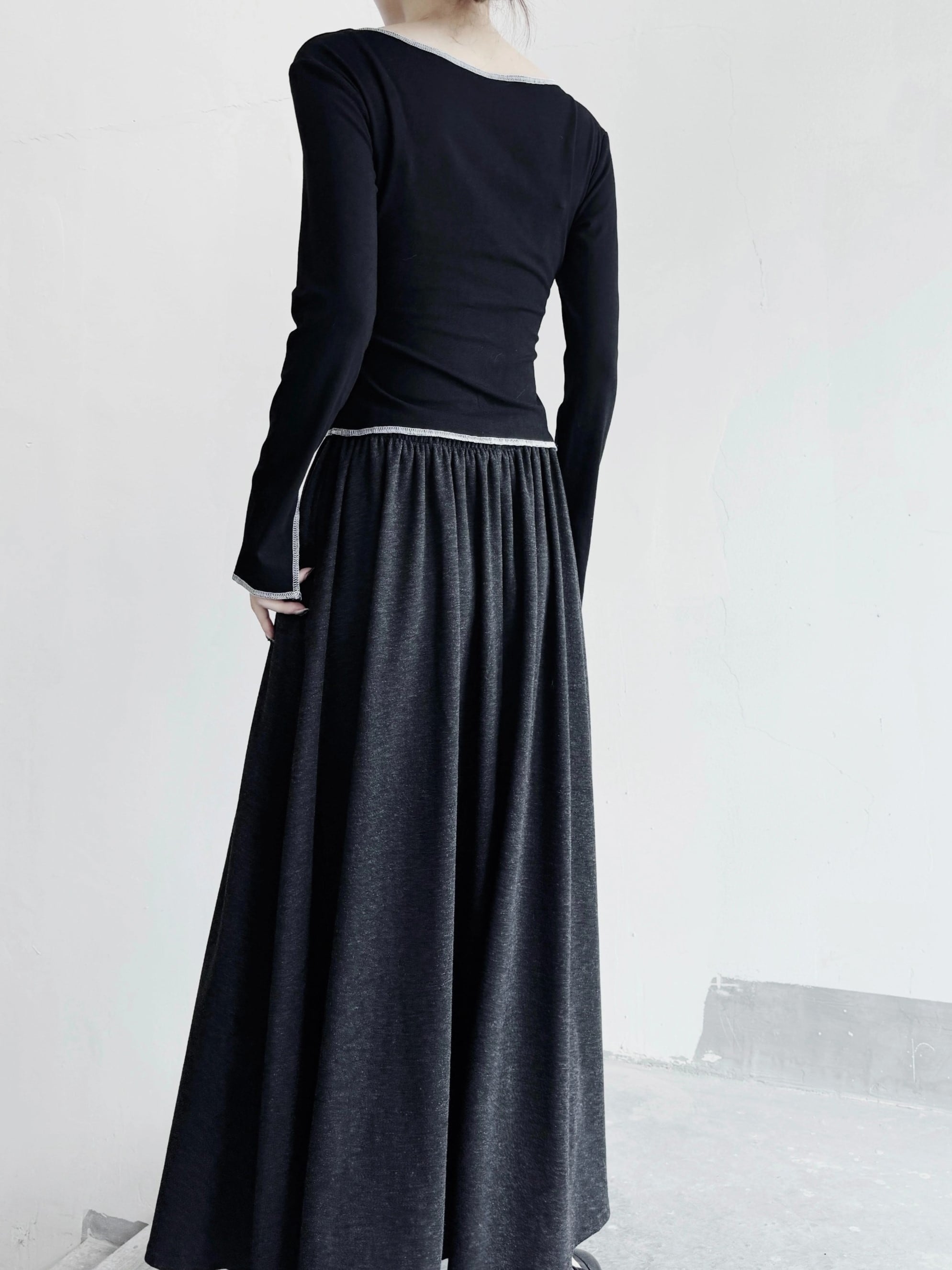 ステッチとカットが目を惹くスリムフィットトップス。